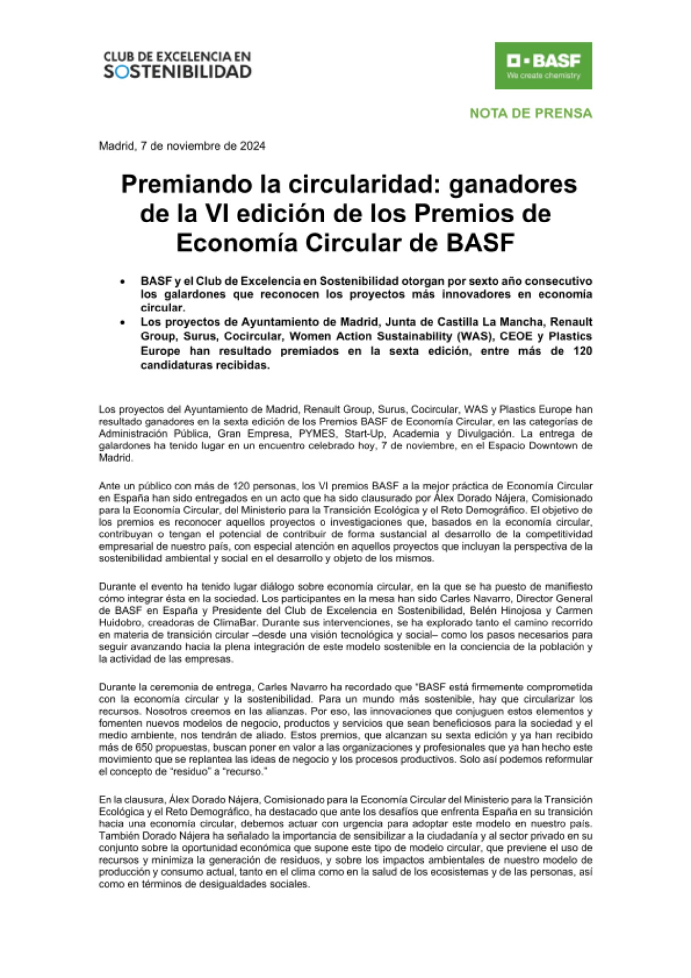 - BASF y el Club de Excelencia en Sostenibilidad otorgan por sexto año consecutivo los galardones que reconocen los proyectos más innovadores en economía circular.