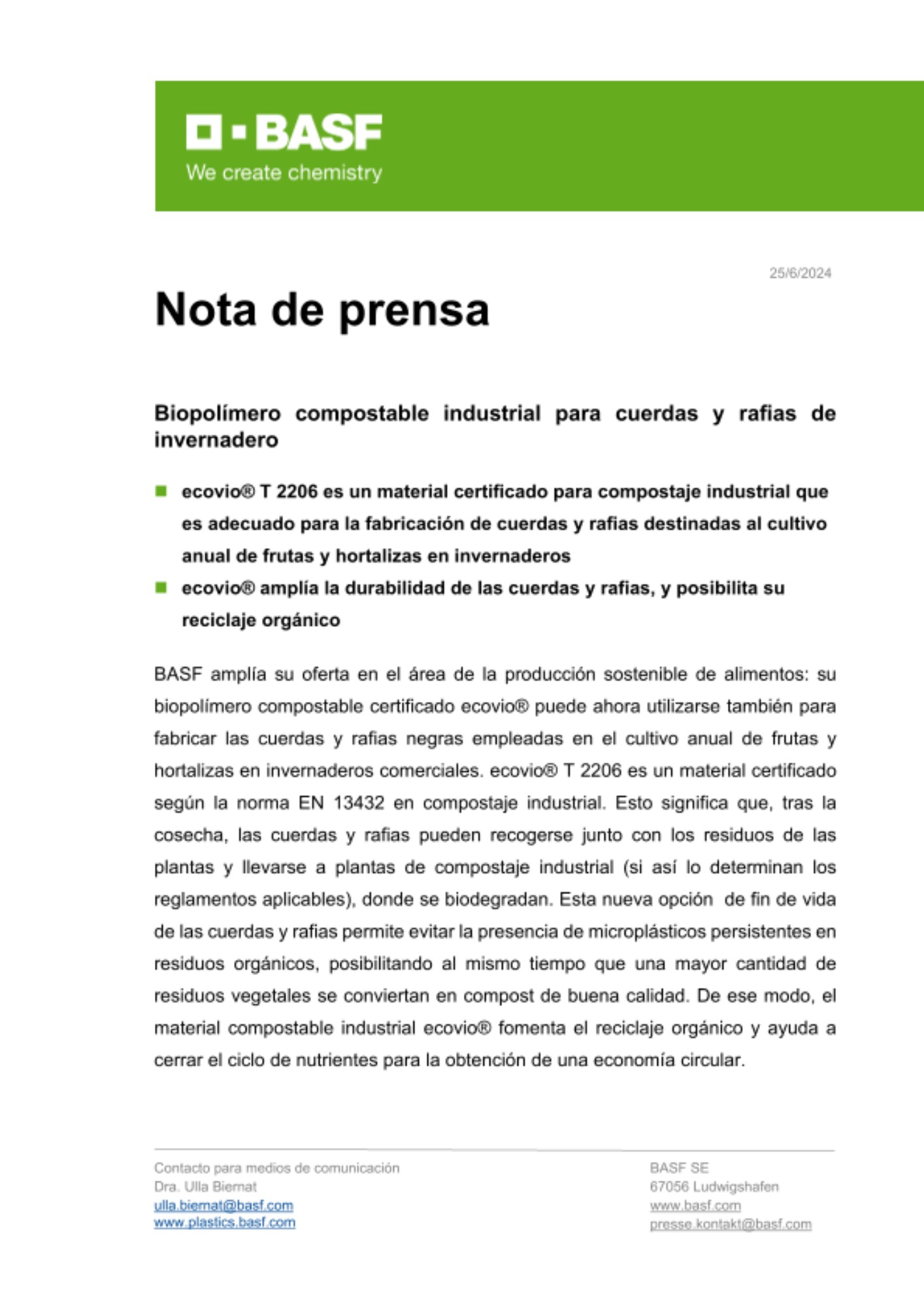 En BASF, creamos química para un futuro sostenible. Combinamos el éxito económico con la protección del medio ambiente y la responsabilidad social. El Grupo BASF cuenta con más de 112.000 colaboradores/as que contribuyen al éxito de nuestros clientes en casi todos los sectores y países del mundo. Nuestra cartera está organizada en seis segmentos: Productos Químicos, Materiales, Soluciones Industriales, Tecnologías de Superficie, Nutrición & Cuidado, y Soluciones Agrícolas. BASF generó ventas por valor de 68.900 millones de euros en 2023. Las acciones de BASF se cotizan en la bolsa de Fráncfort (BAS) y en recibos de depósito americanos (BASFY) en Estados Unidos. Encuentras más información en www.basf.com.