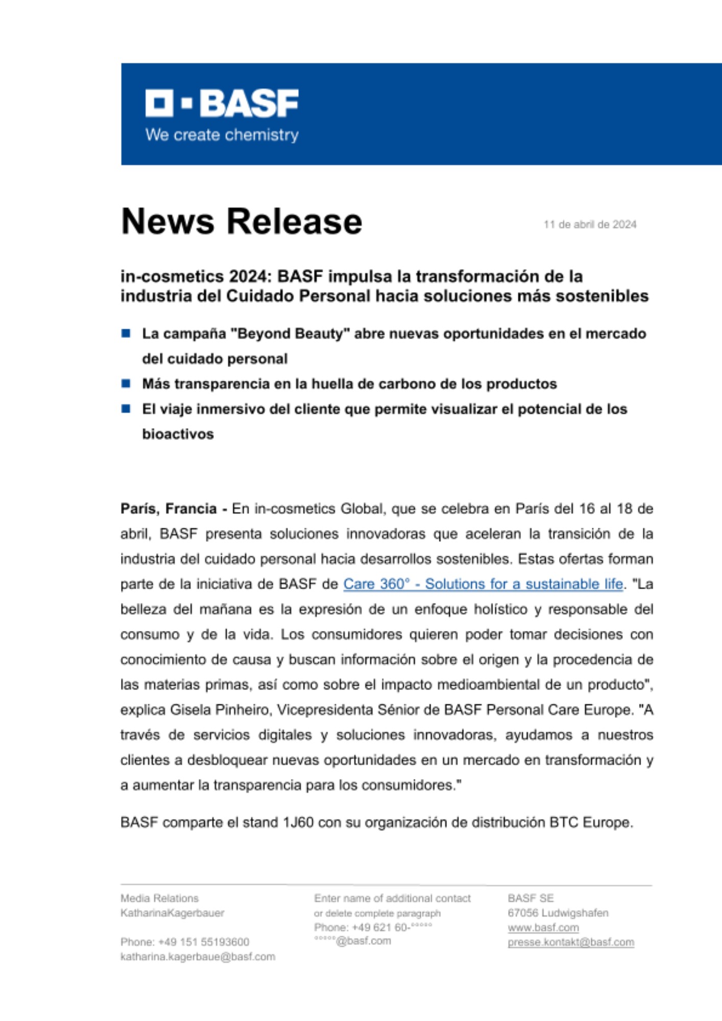 París, Francia - En in-cosmetics Global, que se celebra en París del 16 al 18 de abril, BASF presenta soluciones innovadoras que aceleran la transición de la industria del cuidado personal hacia desarrollos sostenibles. Estas ofertas forman parte de la iniciativa de BASF de Care 360° - Solutions for a sustainable life. "La belleza del mañana es la expresión de un enfoque holístico y responsable del consumo y de la vida. Los consumidores quieren poder tomar decisiones con conocimiento de causa y buscan información sobre el origen y la procedencia de las materias primas, así como sobre el impacto medioambiental de un producto", explica Gisela Pinheiro, Vicepresidenta Sénior de BASF Personal Care Europe. "A través de servicios digitales y soluciones innovadoras, ayudamos a nuestros clientes a desbloquear nuevas oportunidades en un mercado en transformación y a aumentar la transparencia para los consumidores."