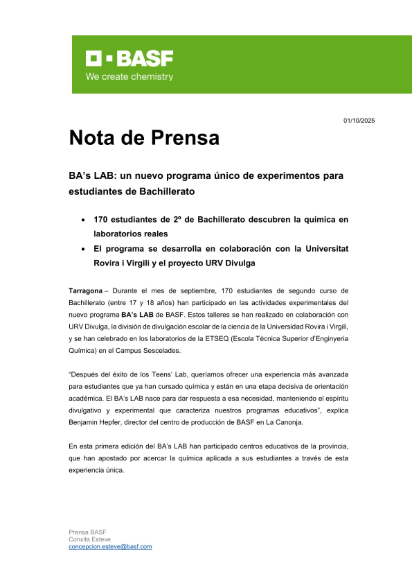 Tarragona – Durante el mes de septiembre, 170 estudiantes de segundo curso de Bachillerato (entre 17 y 18 años) han participado en las actividades experimentales del nuevo programa BA’s LAB de BASF. Estos talleres se han realizado en colaboración con URV Divulga, la división de divulgación escolar de la ciencia de la Universidad Rovira i Virgili, y se han celebrado en los laboratorios de la ETSEQ (Escola Tècnica Superior d’Enginyeria Química) en el Campus Sescelades.