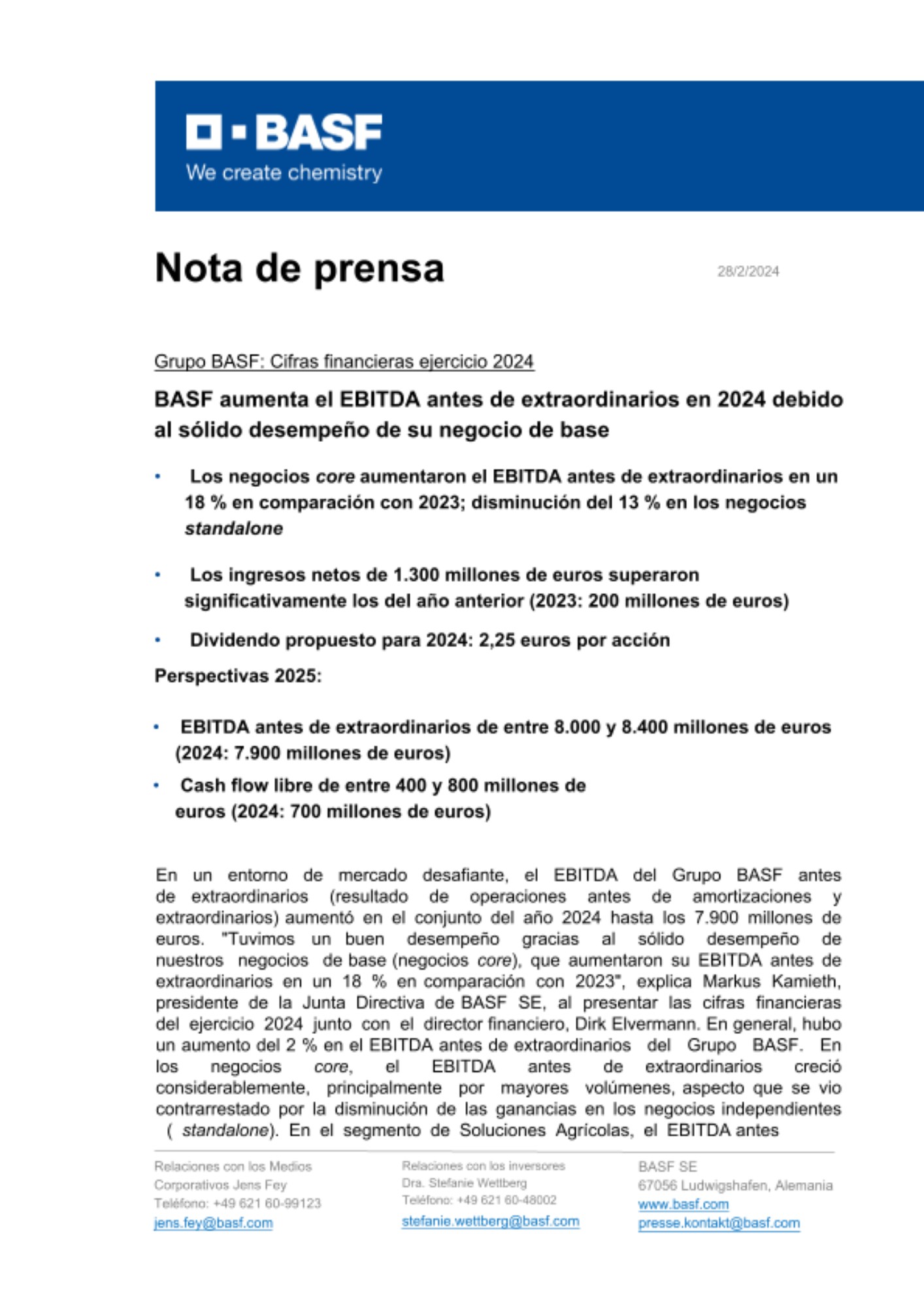 En un entorno de mercado desafiante, el EBITDA del Grupo BASF antes de extraordinarios (resultado de operaciones antes de amortizaciones y extraordinarios) aumentó en el conjunto del año 2024 hasta los 7.900 millones de euros. "Tuvimos un buen desempeño gracias al sólido desempeño de nuestros negocios de base (negocios core), que aumentaron su EBITDA antes de extraordinarios en un 18 % en comparación con 2023", explica Markus Kamieth, presidente de la Junta Directiva de BASF SE, al presentar las cifras financieras del ejercicio 2024 junto con el director financiero, Dirk Elvermann. En general, hubo un aumento del 2 % en el EBITDA antes de extraordinarios del Grupo BASF. En los negocios core, el EBITDA antes de extraordinarios creció considerablemente, principalmente por mayores volúmenes, aspecto que se vio contrarrestado por la disminución de las ganancias en los negocios independientes (o standalone). En el segmento de Soluciones Agrícolas, el EBITDA antes de extraordinarios, disminuyeron considerablemente, principalmente como resultado de la evolución del negocio de glufosinato de amonio. La fuerte caída de los precios de los metales preciosos y los menores volúmenes de ventas en la división de catalizadores fueron las principales razones del ligero descenso de los beneficios de Tecnologías de Superficie. El margen EBITDA antes de extraordinarios del Grupo BASF alcanzó el 12%, en comparación con el 11,1 % del año anterior. Excluyendo los ingresos de metales preciosos y comunes, el margen EBITDA antes de extraordinarios del Grupo BASF aumentó del 12,6 % en 2023 al 13,1 % en 2024.
