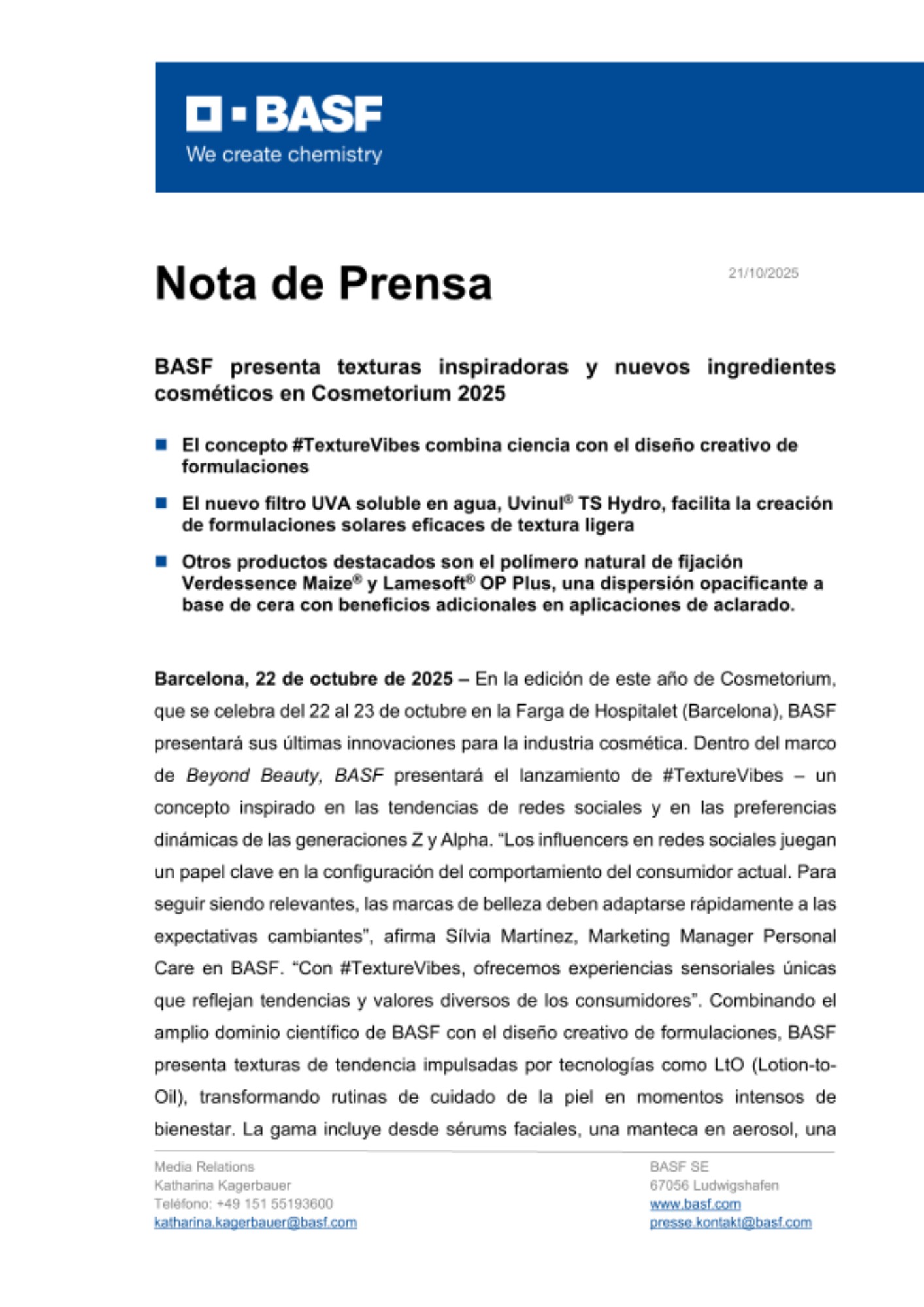 Barcelona, 21 de octubre de 2025 – En la edición de este año de Cosmetorium, que se celebra del 22 al 23 de octubre en la Farga de Hospitalet (Barcelona), BASF presentará sus últimas innovaciones para la industria cosmética. Dentro del marco de Beyond Beauty, BASF presentará el lanzamiento de #TextureVibes – un concepto inspirado en las tendencias de redes sociales y en las preferencias dinámicas de las generaciones Z y Alpha. “Los influencers en redes sociales juegan un papel clave en la configuración del comportamiento del consumidor actual. Para seguir siendo relevantes, las marcas de belleza deben adaptarse rápidamente a las expectativas cambiantes”, afirma Sílvia Martínez, Marketing Manager Personal Care en BASF. “Con #TextureVibes, ofrecemos experiencias sensoriales únicas que reflejan tendencias y valores diversos de los consumidores”. Combinando el amplio dominio científico de BASF con el diseño creativo de formulaciones, BASF presenta texturas de tendencia impulsadas por tecnologías como LtO (Lotion-to-Oil), transformando rutinas de cuidado de la piel en momentos intensos de bienestar. La gama incluye desde sérums faciales, una manteca en aerosol, una mascarilla peel-off, formulaciones multifásicas y solares, entre otras. Algunas formulaciones han sido evaluadas con el enfoque MindMotion de BASF, que mide cómo los productos de cuidado personal afectan el bienestar emocional de los consumidores. Los expertos de BASF presentarán el nuevo concepto junto con los últimos lanzamientos de la compañía en el stand 625.