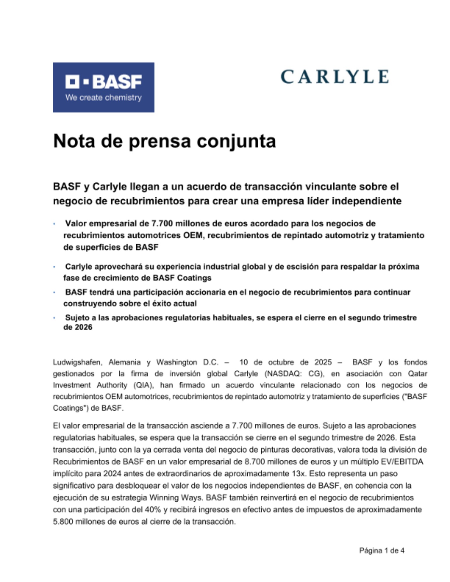 Ludwigshafen, Alemania y Washington D.C. – 10 de octubre de 2025 – BASF y los fondos gestionados por la firma de inversión global Carlyle (NASDAQ: CG), en asociación con Qatar Investment Authority (QIA), han firmado un acuerdo vinculante relacionado con los negocios de recubrimientos OEM automotrices, recubrimientos de repintado automotriz y tratamiento de superficies ("BASF Coatings") de BASF.