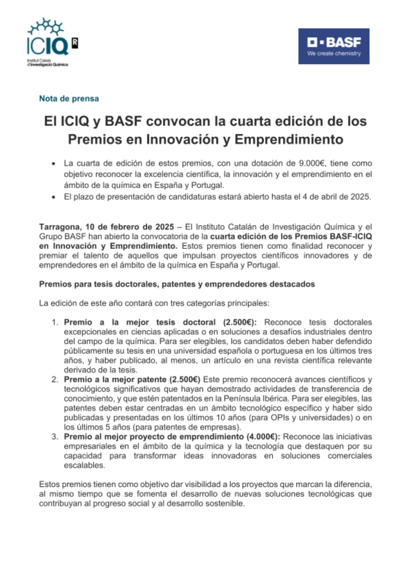 Tarragona, 10 de febrero de 2025 – El Instituto Catalán de Investigación Química y el Grupo BASF han abierto la convocatoria de la cuarta edición de los Premios BASF-ICIQ en Innovación y Emprendimiento. Estos premios tienen como finalidad reconocer y premiar el talento de aquellos que impulsan proyectos científicos innovadores y de emprendedores en el ámbito de la química en España y Portugal.