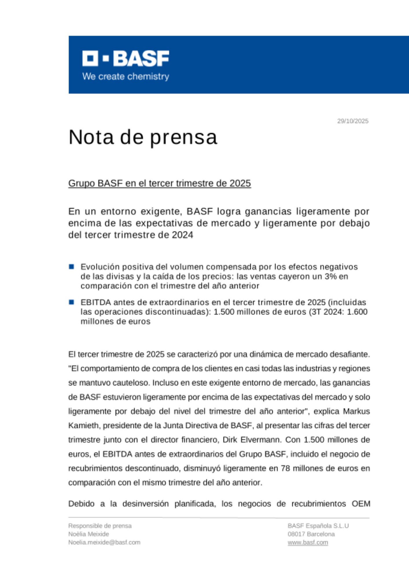 El tercer trimestre de 2025 se caracterizó por una dinámica de mercado desafiante. "El comportamiento de compra de los clientes en casi todas las industrias y regiones se mantuvo cauteloso. Incluso en este exigente entorno de mercado, las ganancias de BASF estuvieron ligeramente por encima de las expectativas del mercado y solo ligeramente por debajo del nivel del trimestre del año anterior", explica Markus Kamieth, presidente de la Junta Directiva de BASF, al presentar las cifras del tercer trimestre junto con el director financiero, Dirk Elvermann. Con 1.500 millones de euros, el EBITDA antes de extraordinarios del Grupo BASF, incluido el negocio de recubrimientos descontinuado, disminuyó ligeramente en 78 millones de euros en comparación con el mismo trimestre del año anterior.