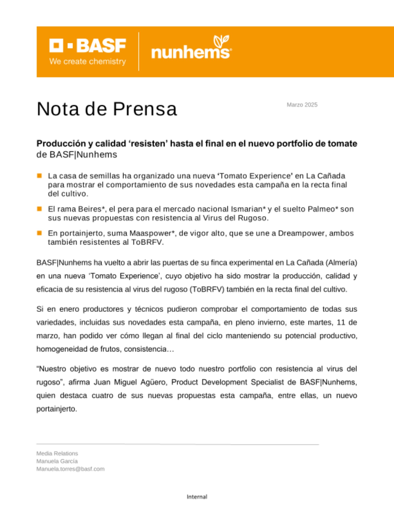 La apuesta de BASF|Nunhems en tomate se sustenta en tres grandes pilares: la producción que el agricultor espera, con la calidad que necesita y la resistencia contrastada de que le permita dar cumplimiento a los dos anteriores.