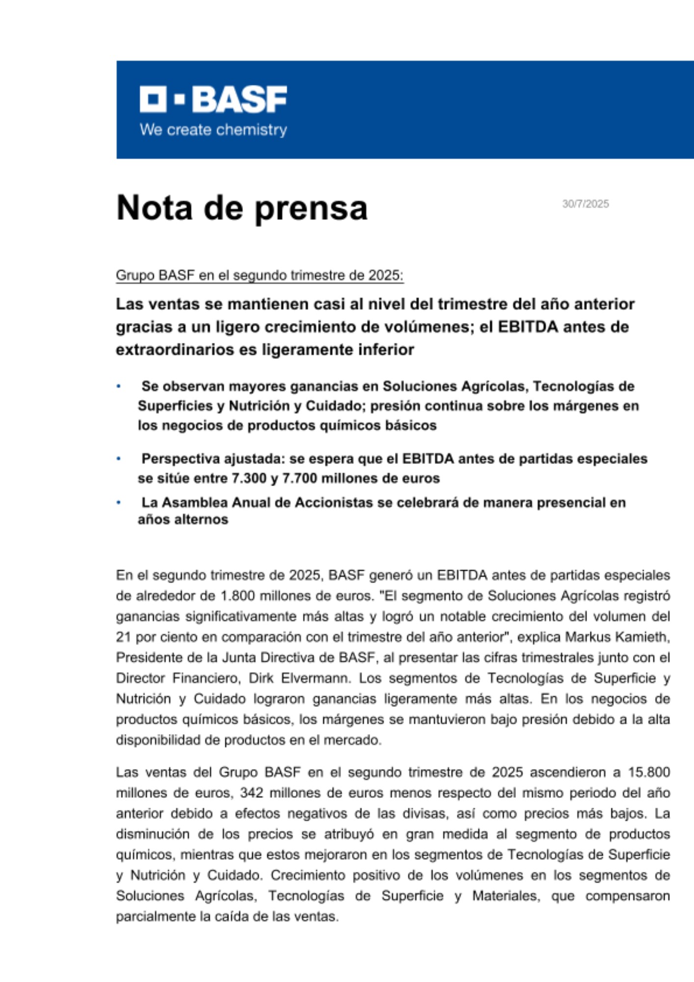 Este comunicado contiene proyecciones futuras. Todas ellas están basadas en estimaciones presentes y en proyecciones del Consejo de Administración y en la información que tenemos actualmente disponible. Las proyecciones futuras no son garantías de la evolución futura ni de los resultados mencionados. Dependen de una serie de factores; implican varios riesgos e incertidumbres, y están basadas en supuestos que podrían no resultar acertados. BASF no asume ninguna obligación de actualizar las proyecciones futuras contenidas en el presente comunicado ni ninguna responsabilidad más allá de las exigencias legales.