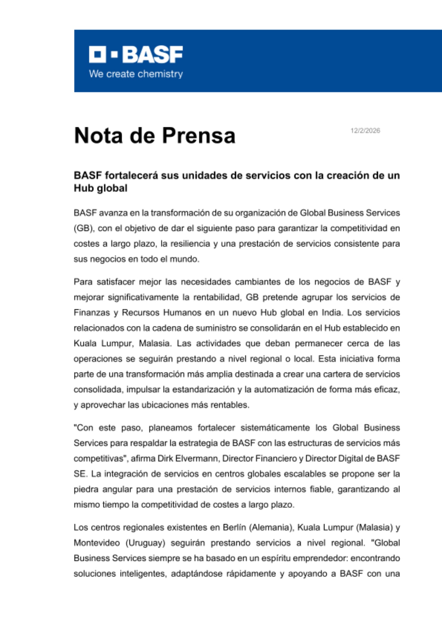 Los centros regionales existentes en Berlín (Alemania), Kuala Lumpur (Malasia) y Montevideo (Uruguay) seguirán prestando servicios a nivel regional. "Global Business Services siempre se ha basado en un espíritu emprendedor: encontrando soluciones inteligentes, adaptándose rápidamente y apoyando a BASF con una sólida mentalidad de servicio. Al dar este siguiente paso, la comunicación temprana y transparente es esencial para nosotros", afirma Tobias Dratt, presidente de Global Business Services, y añade: "El próximo proyecto nos brinda la oportunidad de construir una organización más ágil y adaptada a sus objetivos que siga generando valor para los negocios de BASF". Actualmente, se está trabajando para tener más detalles y se garantizará la participación oportuna de los respectivos representantes de las personas trabajadoras, de acuerdo con las leyes y normativas locales.