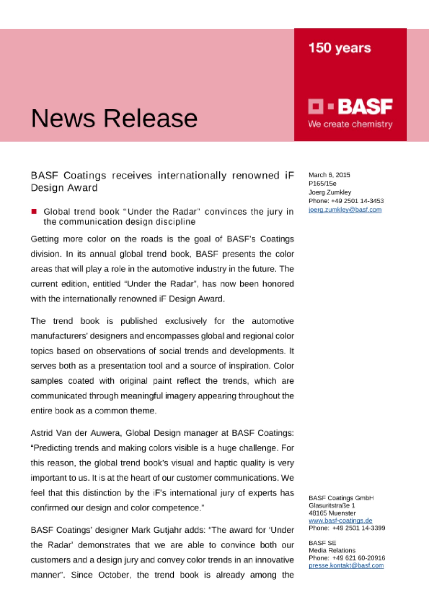 BASF Coatings’ designer Mark Gutjahr adds: “The award for ‘Under the Radar’ demonstrates that we are able to convince both our customers and a design jury and convey color trends in an innovative manner”. Since October, the trend book is already among the laureates of the Red Dot Award: Communication Design. With the iF Design Award, BASF is once again successfully represented among the two most prestigious international design competitions.