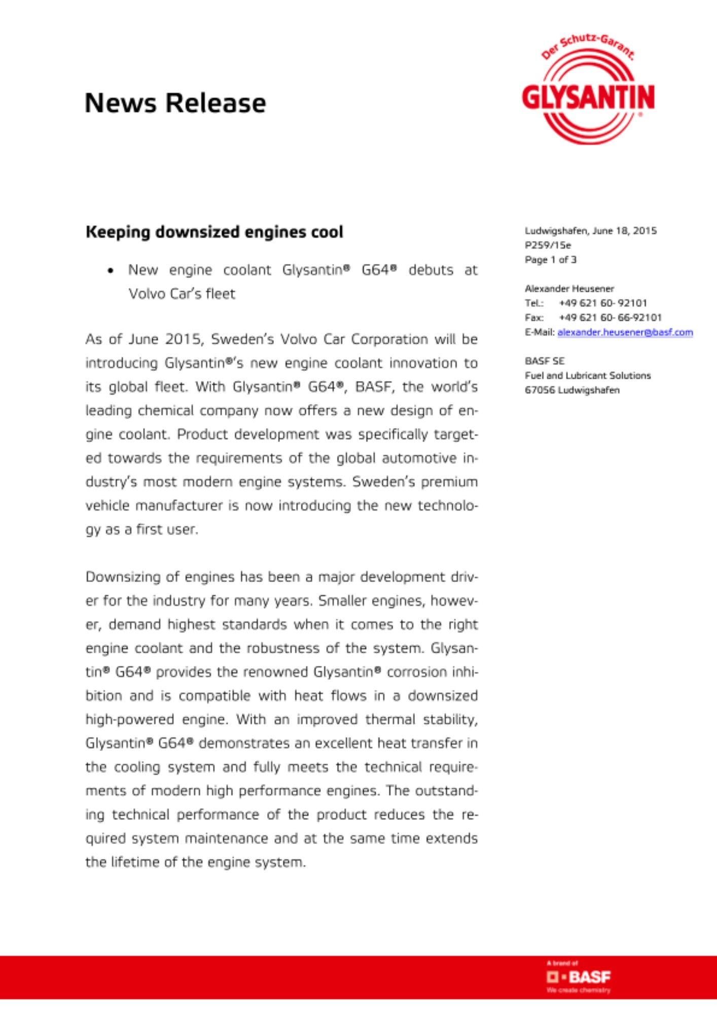 “Reducing emissions and, improving fuel economy are a key challenge of the 21st century,” states Michael Fleiss, Head of Powertrain Development at Volvo Cars. “Our engine development has consistently been driven towards this goal. In consequence, we were among the first manufacturers to broadly introduce downsizing technology to our entire fleet. With BASF’s new engine coolant we are taking a consequent step to match our engines with the ideal coolant product. In addition to technical performance, environmental concern, one of Volvo’s core values, has contributed to choose Glysantin® G64® from BASF.”