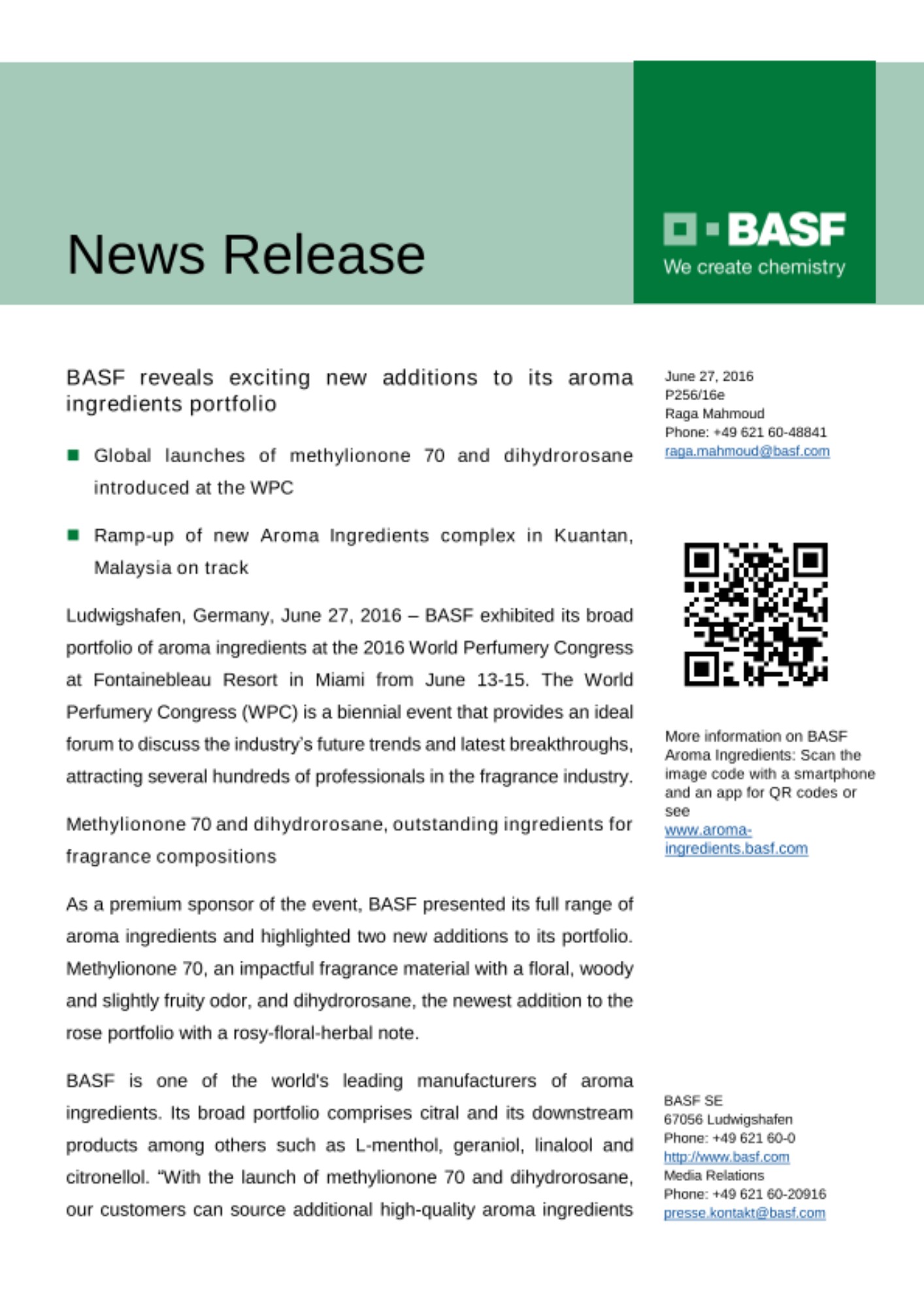 BASF is one of the world's leading manufacturers of aroma ingredients. Its broad portfolio comprises citral and its downstream products among others such as L-menthol, geraniol, linalool and citronellol. “With the launch of methylionone 70 and dihydrorosane, our customers can source additional high-quality aroma ingredients with great value from BASF.” said Christian Seufert, Vice President BASF Aroma Ingredients.