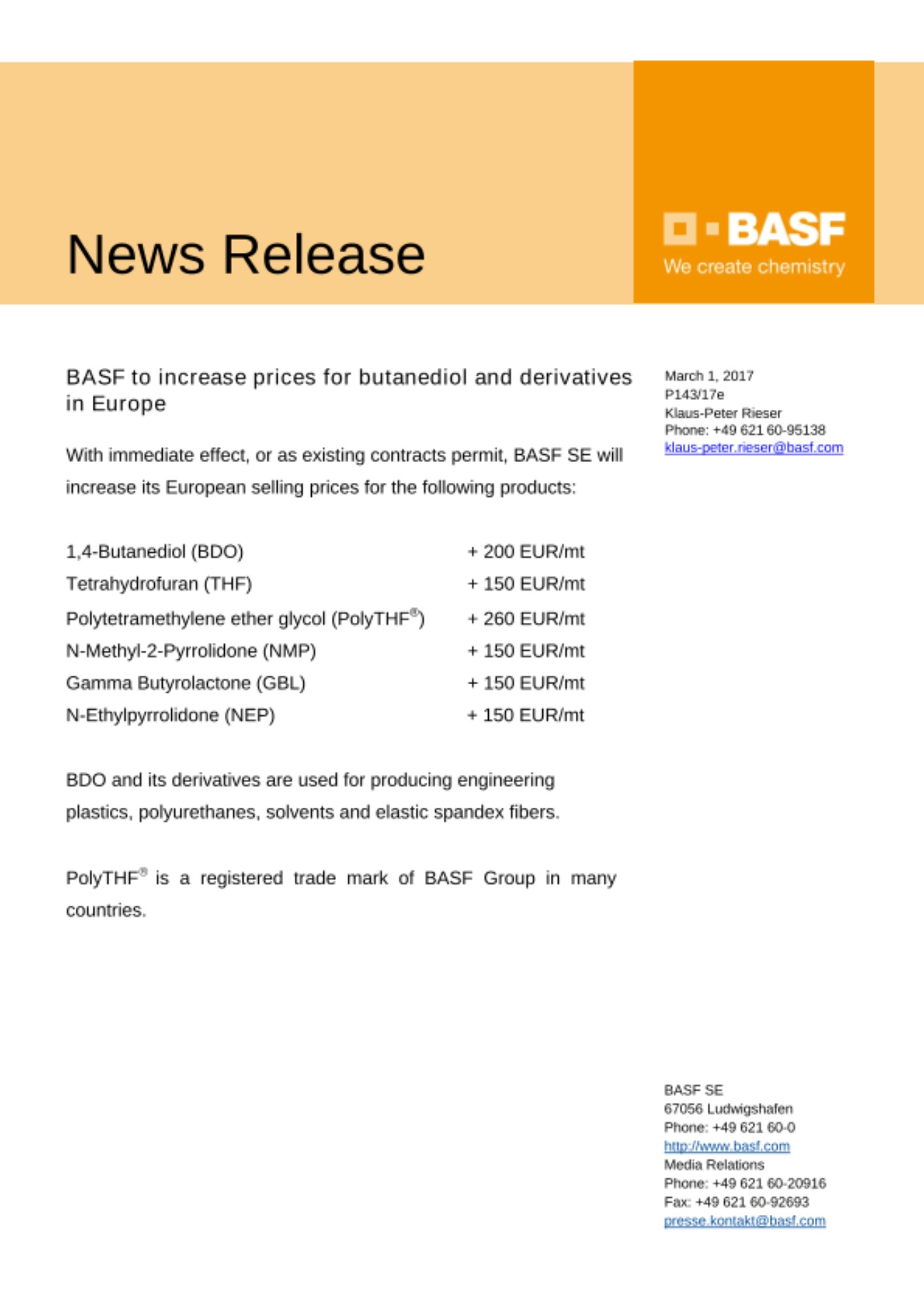 With immediate effect, or as existing contracts permit, BASF SE will increase its European selling prices for the following products: