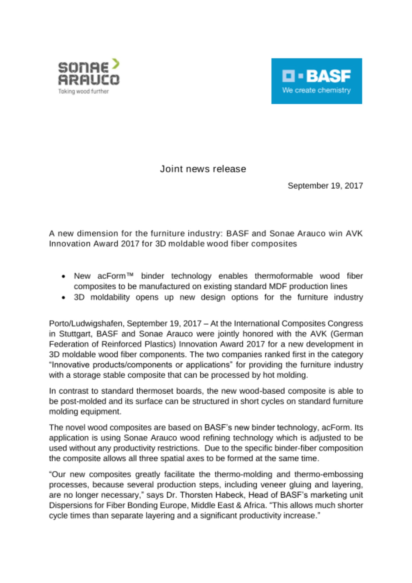 Porto/Ludwigshafen, September 19, 2017 – At the International Composites Congress in Stuttgart, BASF and Sonae Arauco were jointly honored with the AVK (German Federation of Reinforced Plastics) Innovation Award 2017 for a new development in 3D moldable wood fiber components. The two companies ranked first in the category “Innovative products/components or applications” for providing the furniture industry with a storage stable composite that can be processed by hot molding.