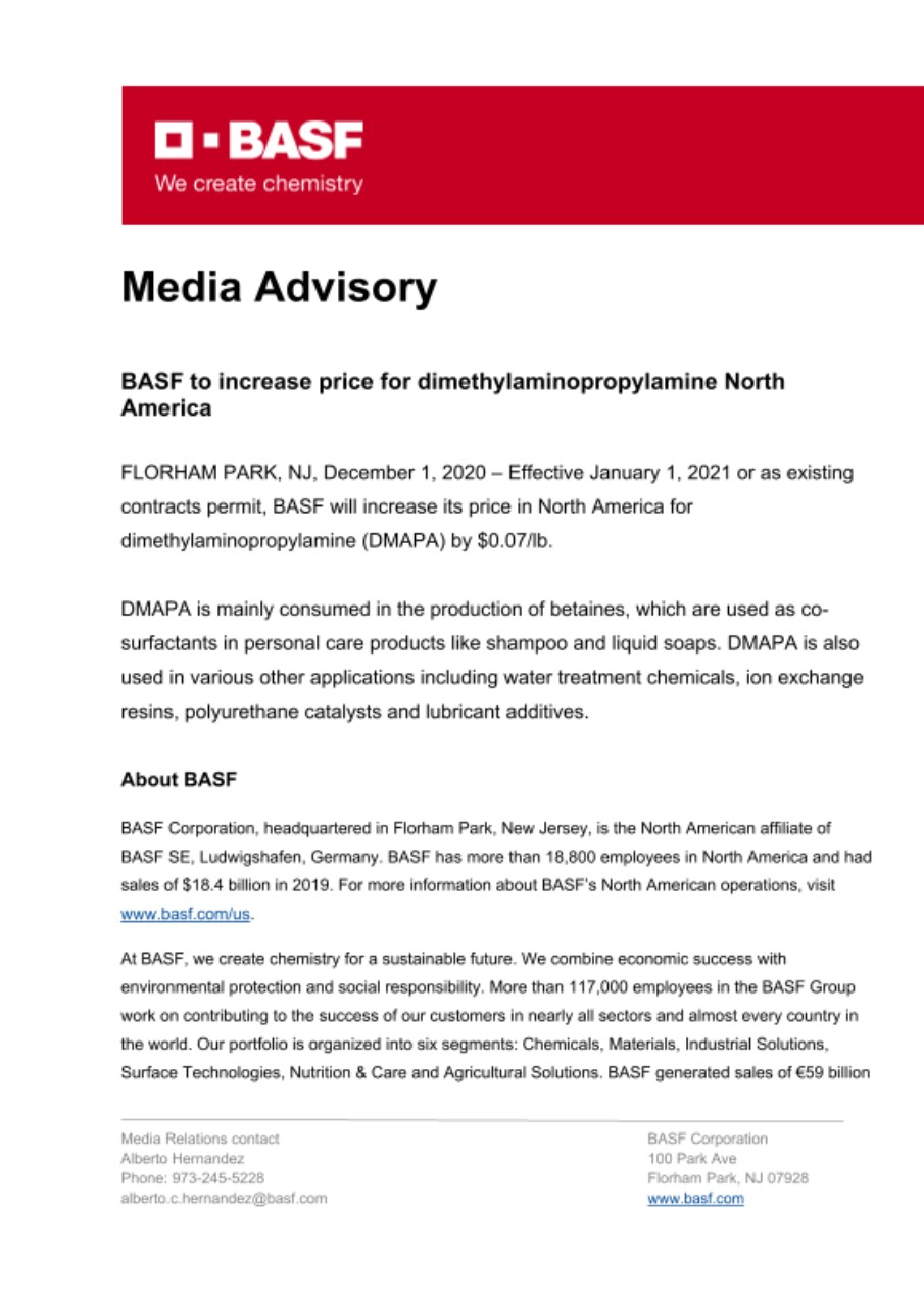 FLORHAM PARK, NJ, December 1, 2020 – Effective January 1, 2021 or as existing contracts permit, BASF will increase its price in North America for dimethylaminopropylamine (DMAPA) by $0.07/lb.