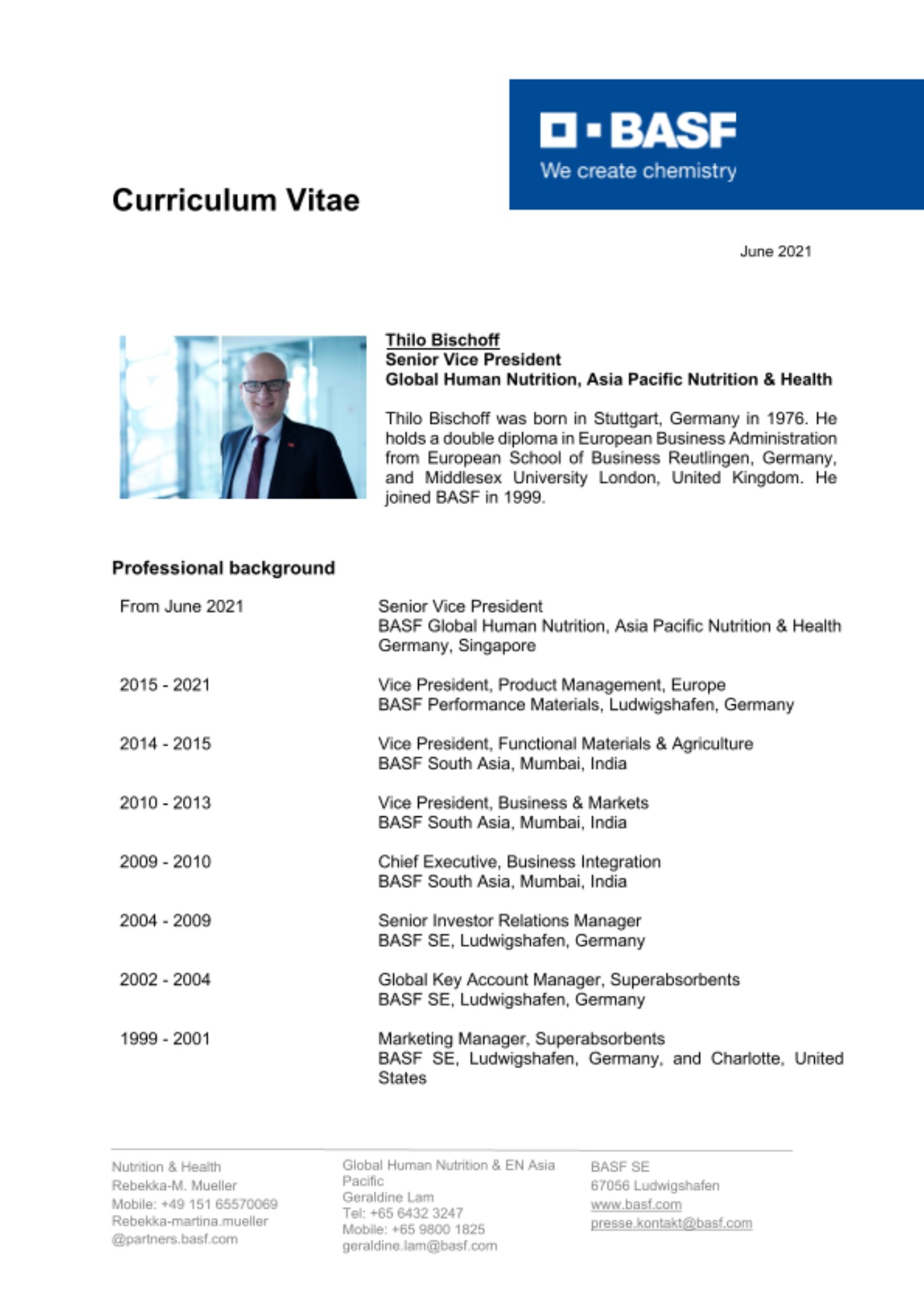 Personnel Changes at BASF Nutrition & Health - Thilo Bischoff appointed new Senior Vice President Human Nutrition