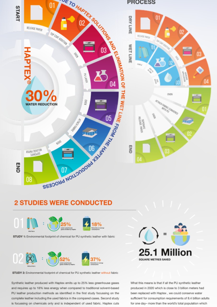 The LCA study shows that Haptex outperformed synthetic leathers from solvent-based and waterborne-based synthetic leather processes, in terms of carbon emissions. For instance, Haptex was proven to produce 52% less greenhouse gas emissions than conventional synthetic leather, with more than a 20% reduction in energy consumption when using 1KG of chemicals for synthetic leather production. This is predominantly due to eliminating the wet line from the production processes, which reduces 30% of water usage compared to usual solvent-based polyurethane production methods.