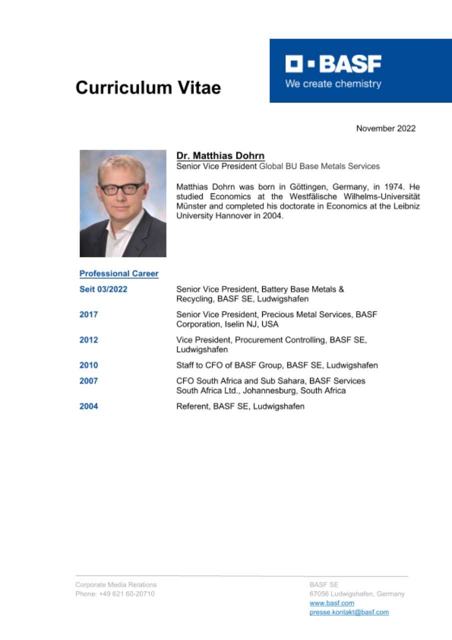 Matthias Dohrn (48) will assume responsibility for the Global Procurement division, based in Ludwigshafen, Germany, as of January 1, 2023. He is currently responsible for the Battery Base Metals & Recycling unit and succeeds Stefano Pigozzi (59), who will retire effective December 31, 2022.