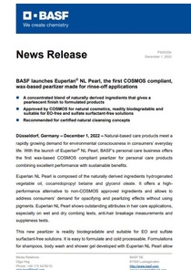 Düsseldorf, Germany – December 1, 2022 – Natural-based care products meet a rapidly growing demand for environmental consciousness in consumers’ everyday life. With the launch of Euperlan® NL Pearl, BASF’s personal care business offers the first wax-based COSMOS compliant pearlizer for personal care products combining excellent performance with sustainable benefits.