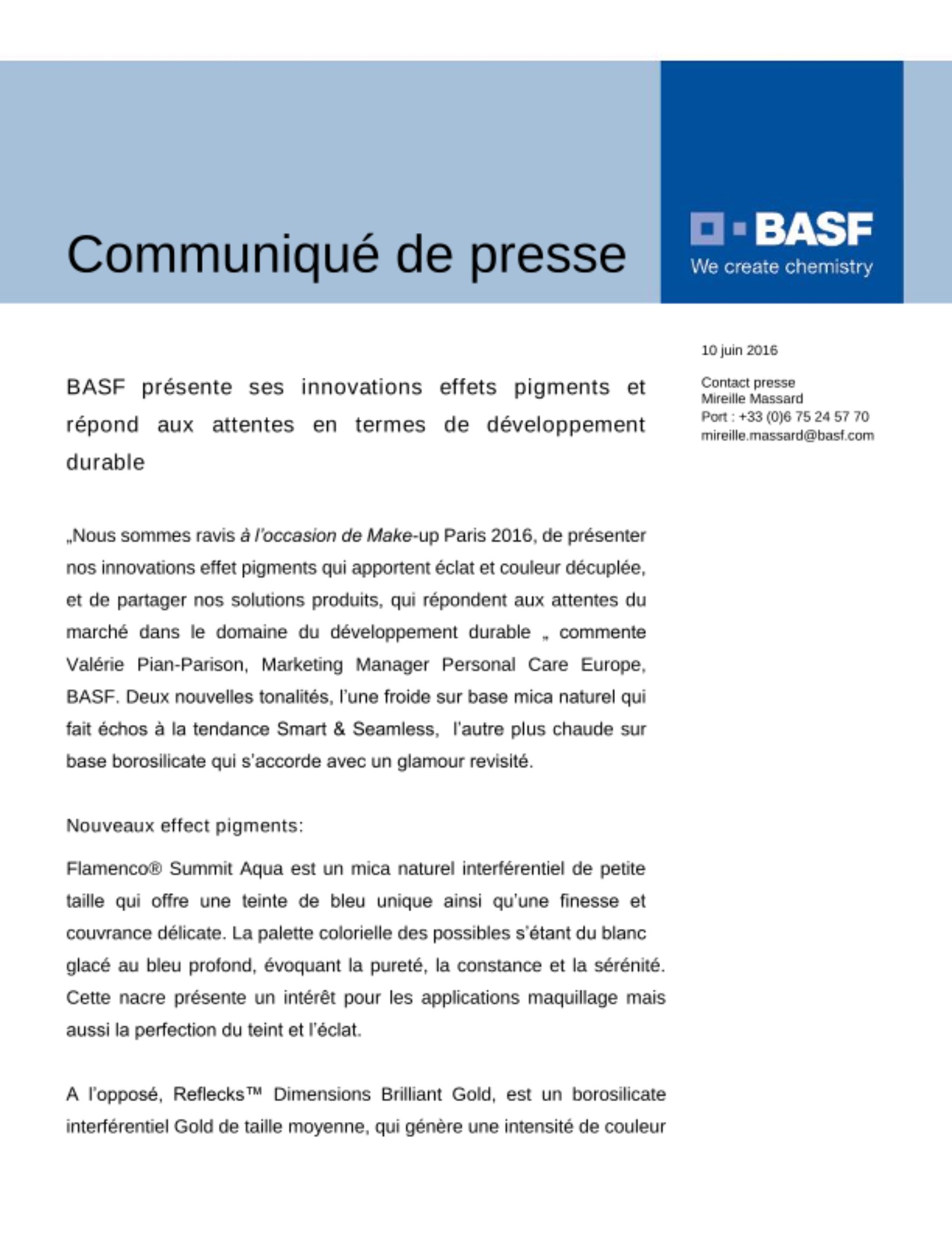 „Nous sommes ravis à l’occasion de Make-up Paris 2016, de présenter nos innovations effet pigments qui apportent éclat et couleur décuplée, et de partager nos solutions produits, qui répondent aux attentes du marché dans le domaine du développement durable „ commente Valérie Pian-Parison, Marketing Manager Personal Care Europe, BASF. Deux nouvelles tonalités, l’une froide sur base mica naturel qui fait échos à la tendance Smart & Seamless, l’autre plus chaude sur base borosilicate qui s’accorde avec un glamour revisité.