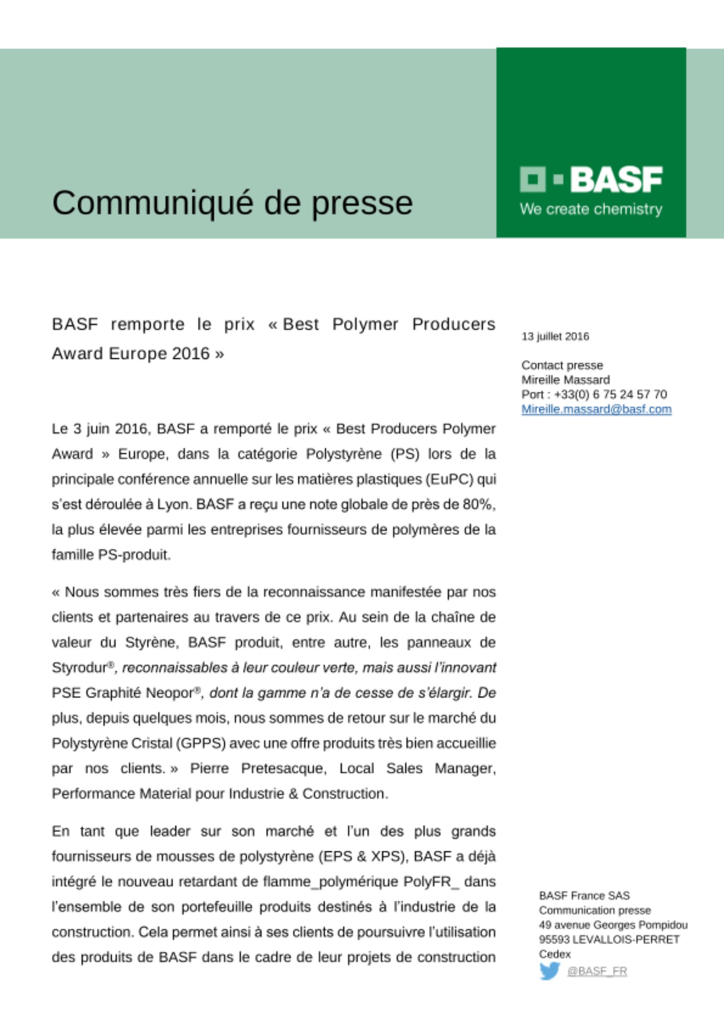 Le 3 juin 2016, BASF a remporté le prix « Best Producers Polymer Award » Europe, dans la catégorie Polystyrène (PS) lors de la principale conférence annuelle sur les matières plastiques (EuPC) qui s’est déroulée à Lyon. BASF a reçu une note globale de près de 80%, la plus élevée parmi les entreprises fournisseurs de polymères de la famille PS-produit.