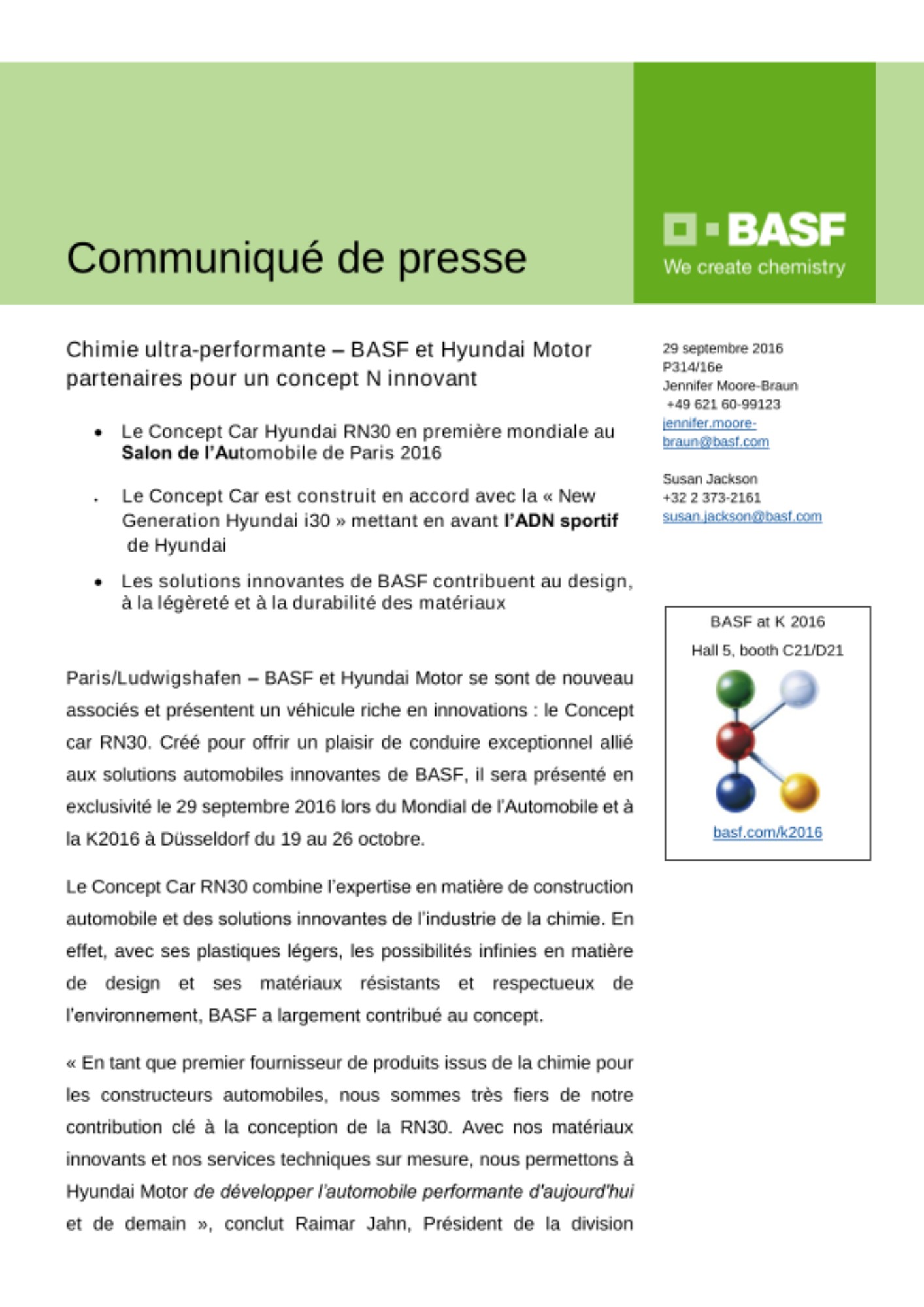 « En tant que premier fournisseur de produits issus de la chimie pour les constructeurs automobiles, nous sommes très fiers de notre contribution clé à la conception de la RN30. Avec nos matériaux innovants et notre support technique sur mesure, nous permettons à Hyundai Motor de développer l’automobile performante d'aujourd'hui et de demain », conclut Raimar Jahn, Président de la division Matériaux de performance de BASF.