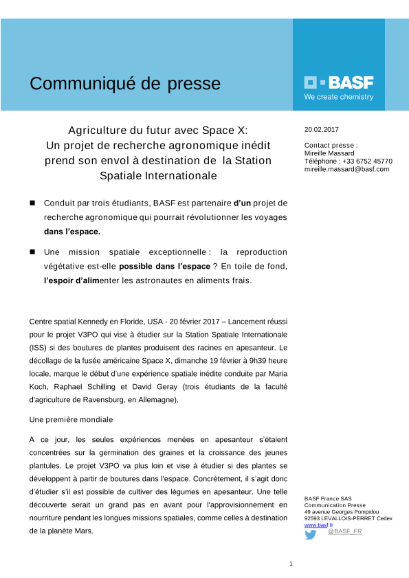 Centre spatial Kennedy en Floride, USA - 20 février 2017 – Lancement réussi pour le projet V3PO qui vise à étudier sur la Station Spatiale Internationale (ISS) si des boutures de plantes produisent des racines en apesanteur. Le décollage de la fusée américaine Space X, dimanche 19 février à 9h39 heure locale, marque le début d’une expérience spatiale inédite conduite par Maria Koch, Raphael Schilling et David Geray (trois étudiants de la faculté d'agriculture de Ravensburg, en Allemagne).