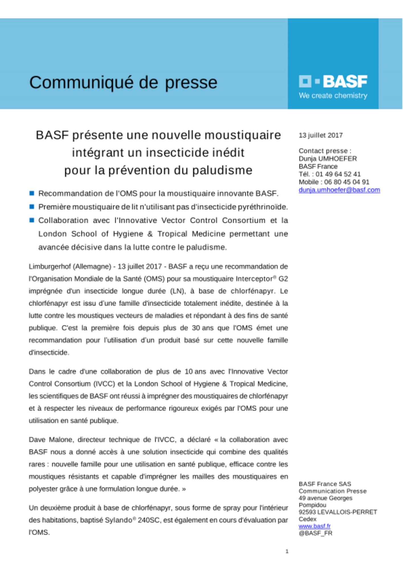 Limburgerhof (Allemagne) - 13 juillet 2017 - BASF a reçu une recommandation de l'Organisation Mondiale de la Santé (OMS) pour sa moustiquaire Interceptor® G2 imprégnée d'un insecticide longue durée (LN), à base de chlorfénapyr. Le chlorfénapyr est issu d’une famille d'insecticide totalement inédite, destinée à la lutte contre les moustiques vecteurs de maladies et répondant à des fins de santé publique. C'est la première fois depuis plus de 30 ans que l'OMS émet une recommandation pour l’utilisation d’un produit basé sur cette nouvelle famille d'insecticide.