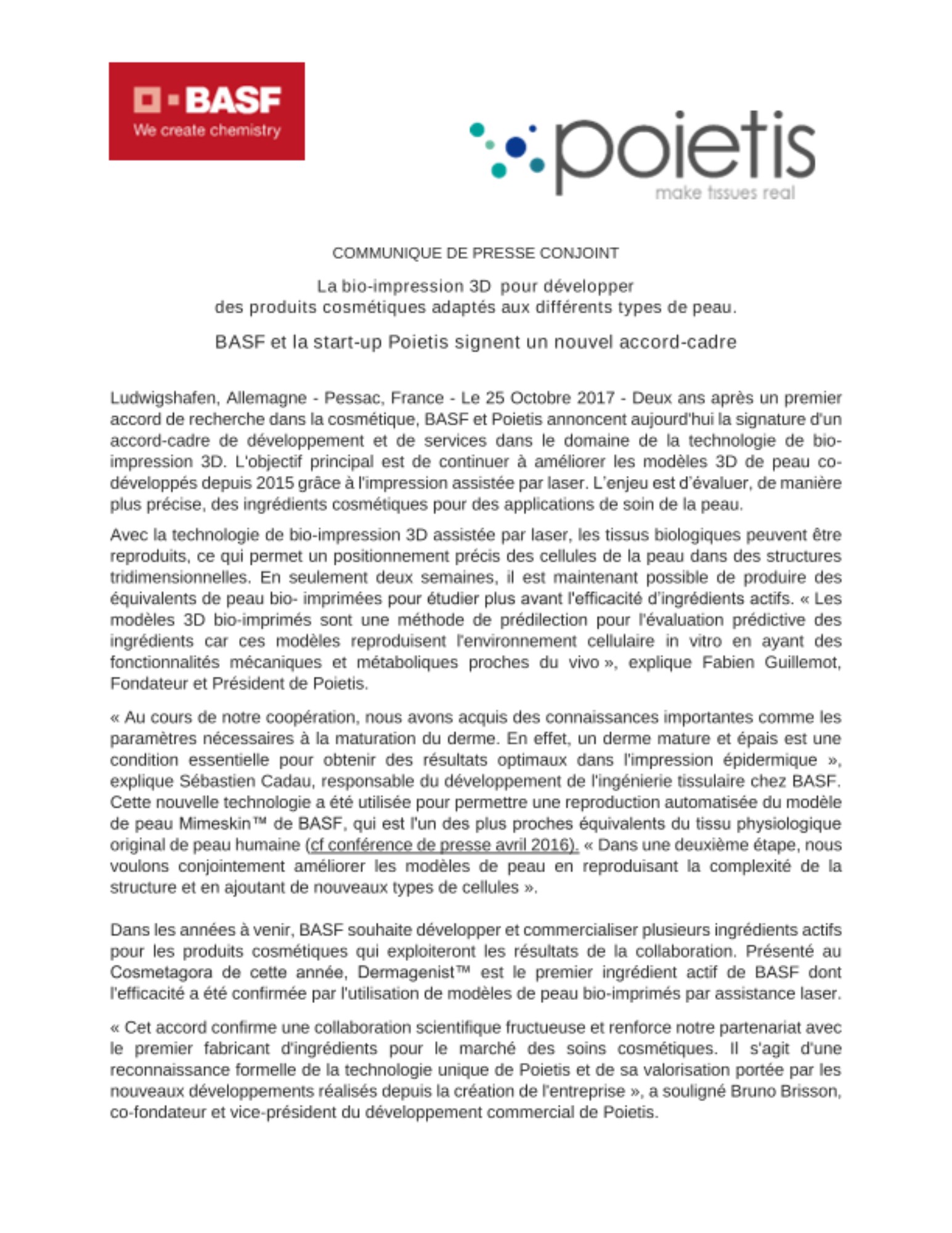 Ludwigshafen, Allemagne - Pessac, France - Le 25 Octobre 2017 - Deux ans après un premier accord de recherche dans la cosmétique, BASF et Poietis annoncent aujourd'hui la signature d'un accord-cadre de développement et de services dans le domaine de la technologie de bio-impression 3D. L'objectif principal est de continuer à améliorer les modèles 3D de peau co-développés depuis 2015 grâce à l'impression assistée par laser. L’enjeu est d’évaluer, de manière plus précise, des ingrédients cosmétiques pour des applications de soin de la peau.