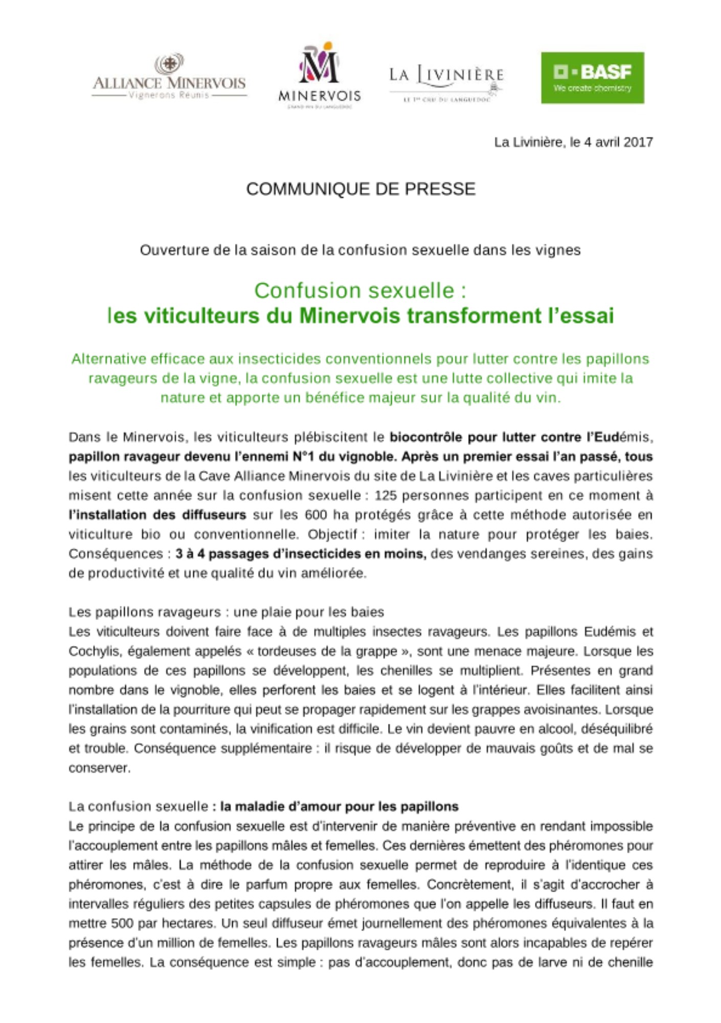 L’expérience acquise depuis des années en matière de protection de la vigne par cette méthode de biocontrôle permet de combiner au mieux les itinéraires techniques et de réduire l’utilisation d’insecticides. La confusion sexuelle nécessite une observation permanente du vignoble et de la présence des papillons ravageurs, à l’extérieur des parcelles et au coeur de celles-ci. Des pièges permettent de capturer les papillons pour établir la courbe de vol et les techniciens observent chaque semaine la présence de glomérules, oeufs, larves ou perforations des baies. En réduisant les risques de développement de champignons, la confusion sexuelle permet d’atteindre une maturité optimale pour des vendanges sereines, synonymes de quantité et de qualité. La vinification est simplifiée avec des mouts plus propres et l’absence d’arrêt de la fermentation. La démarche de la Cave Alliance Minervois du site de La Livinière contribue à renforcer une dynamique territoriale en travaillant avec les caves particulières de La Livinière, les viticulteurs voisins (Pépieux) ou bien encore en associant les lycées agricoles et centres de formation. Le chantier de pose en cours mobilise 125 personnes dont le CFPPA de Carcassonne et le CFA de Narbonne. C’est un véritable partenariat qui est ainsi développé avec une implication des viticulteurs dans la formation. Cette dynamique s’inscrit dans la durée : tous les viticulteurs qui participent à cette lutte collective se sont engagés pour 3 ans. Le développement de la confusion sexuelle est encouragé par le Conseil départemental de l’Hérault. Dans le Sud Est de la France, les surfaces ont été quasiment multipliées par 10 ces dernières années, passant de 2 700 en 2010 à 23 000 ha cette année.