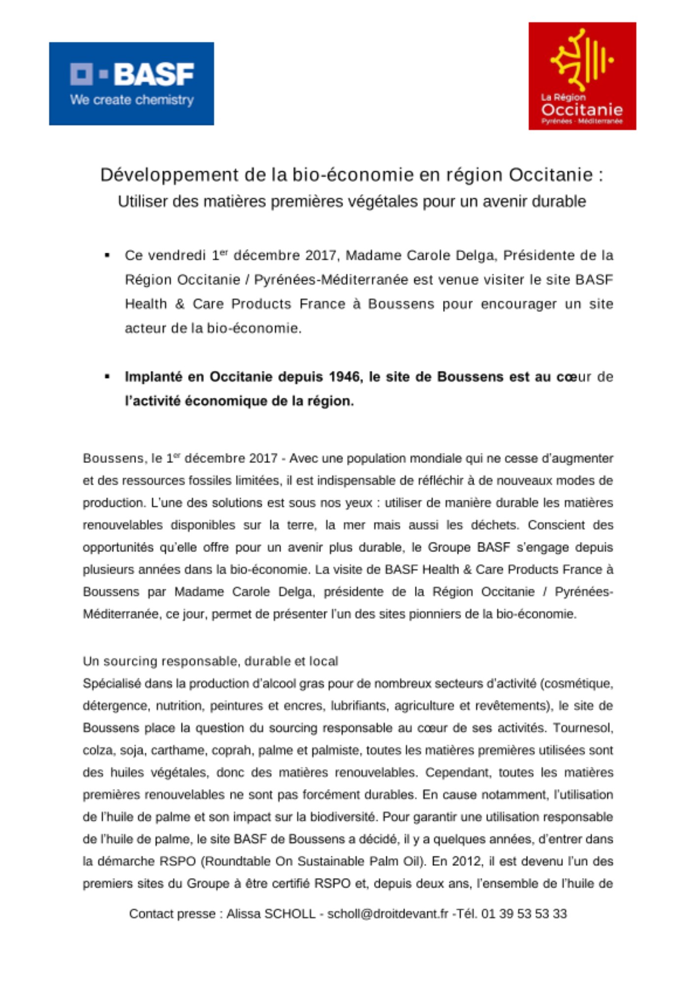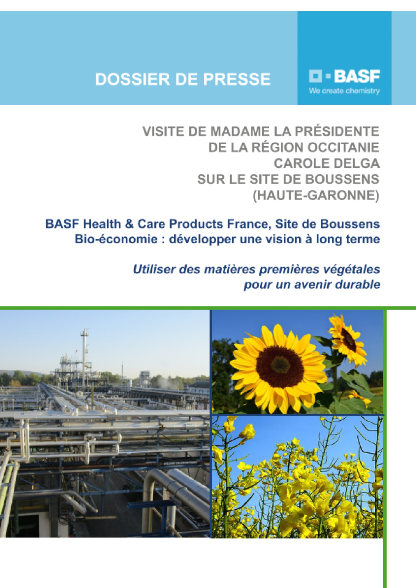 Boussens, le 1er décembre 2017 - Avec une population mondiale qui ne cesse d’augmenter et des ressources fossiles limitées, il est indispensable de réfléchir à de nouveaux modes de production. L’une des solutions est sous nos yeux : utiliser de manière durable les matières renouvelables disponibles sur la terre, la mer mais aussi les déchets. Conscient des opportunités qu’elle offre pour un avenir plus durable, le Groupe BASF s’engage depuis plusieurs années dans la bio-économie. La visite de BASF Health & Care Products France à Boussens par Madame Carole Delga, présidente de la Région Occitanie / Pyrénées-Méditerranée, ce jour, permet de présenter l’un des sites pionniers de la bio-économie.