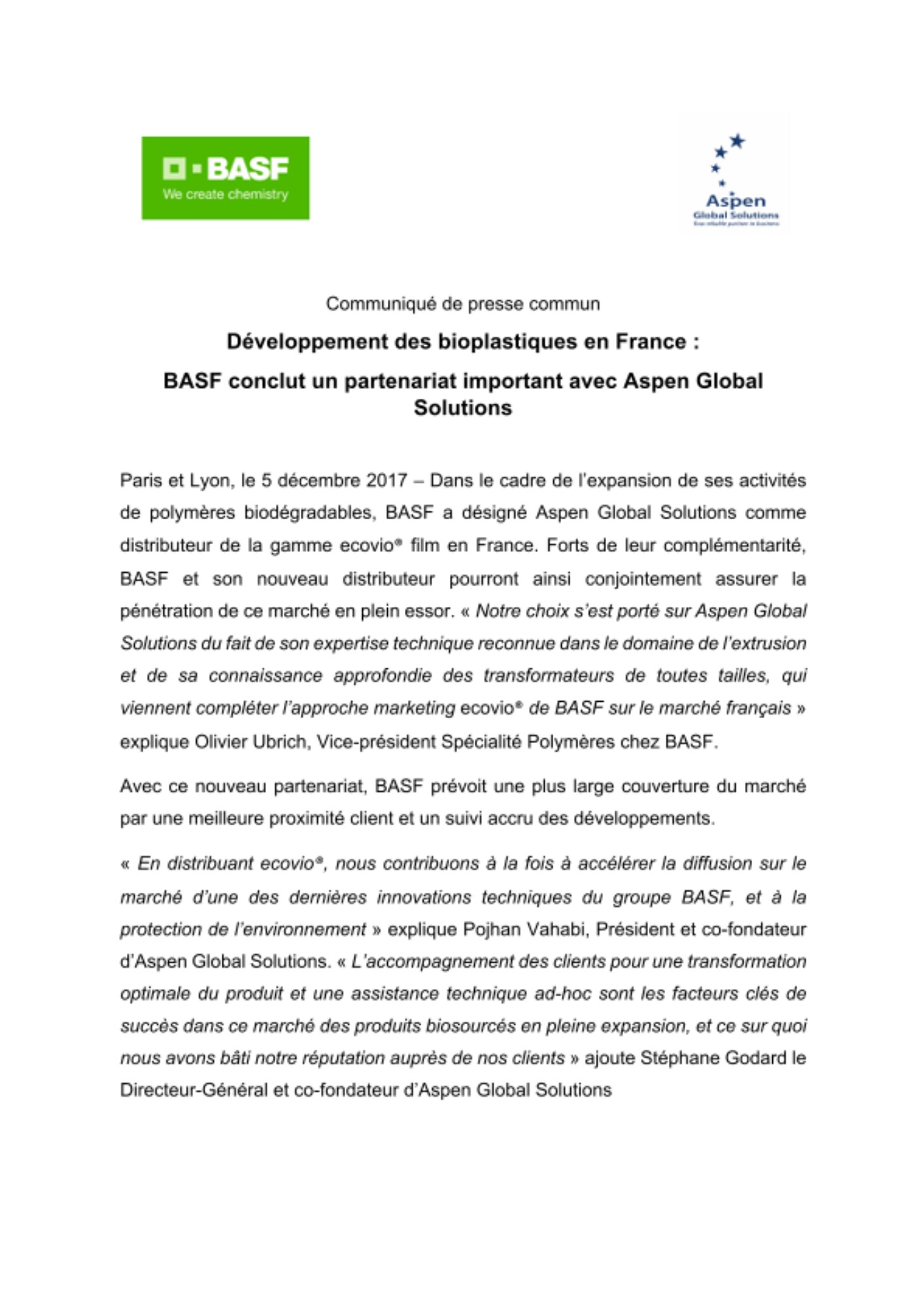 Paris et Lyon, le 5 décembre 2017 – Dans le cadre de l’expansion de ses activités de polymères biodégradables, BASF a désigné Aspen Global Solutions comme distributeur de la gamme ecovio® film en France. Forts de leur complémentarité,