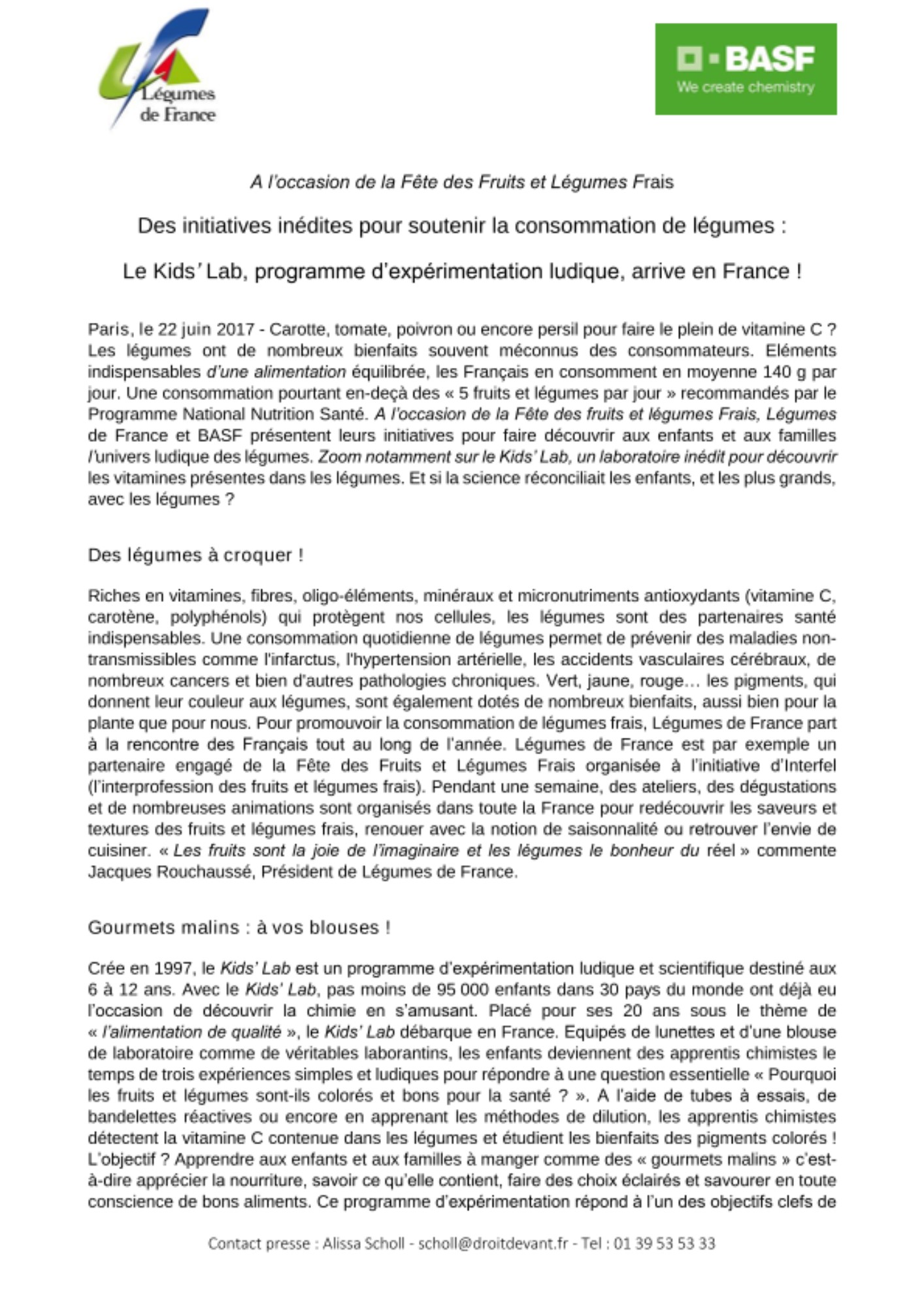 Paris, le 22 juin 2017 - Carotte, tomate, poivron ou encore persil pour faire le plein de vitamine C ? Les légumes ont de nombreux bienfaits souvent méconnus des consommateurs. Eléments indispensables d’une alimentation équilibrée, les Français en consomment en moyenne 140 g par jour. Une consommation pourtant en-deçà des « 5 fruits et légumes par jour » recommandés par le Programme National Nutrition Santé. A l’occasion de la Fête des fruits et légumes Frais, Légumes de France et BASF présentent leurs initiatives pour faire découvrir aux enfants et aux familles l’univers ludique des légumes. Zoom notamment sur le Kids’ Lab, un laboratoire inédit pour découvrir les vitamines présentes dans les légumes. Et si la science réconciliait les enfants, et les plus grands, avec les légumes ?
