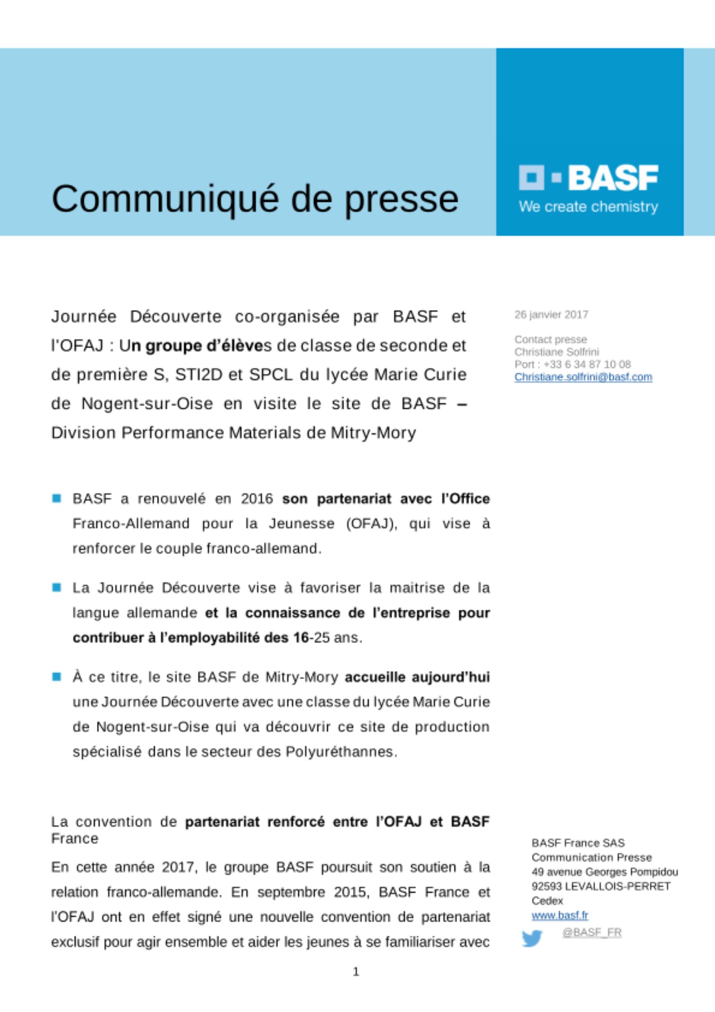 - À ce titre, le site BASF de Mitry-Mory accueille aujourd’hui une Journée Découverte avec une classe du lycée Marie Curie de Nogent-sur-Oise qui va découvrir ce site de production spécialisé dans le secteur des Polyuréthannes.