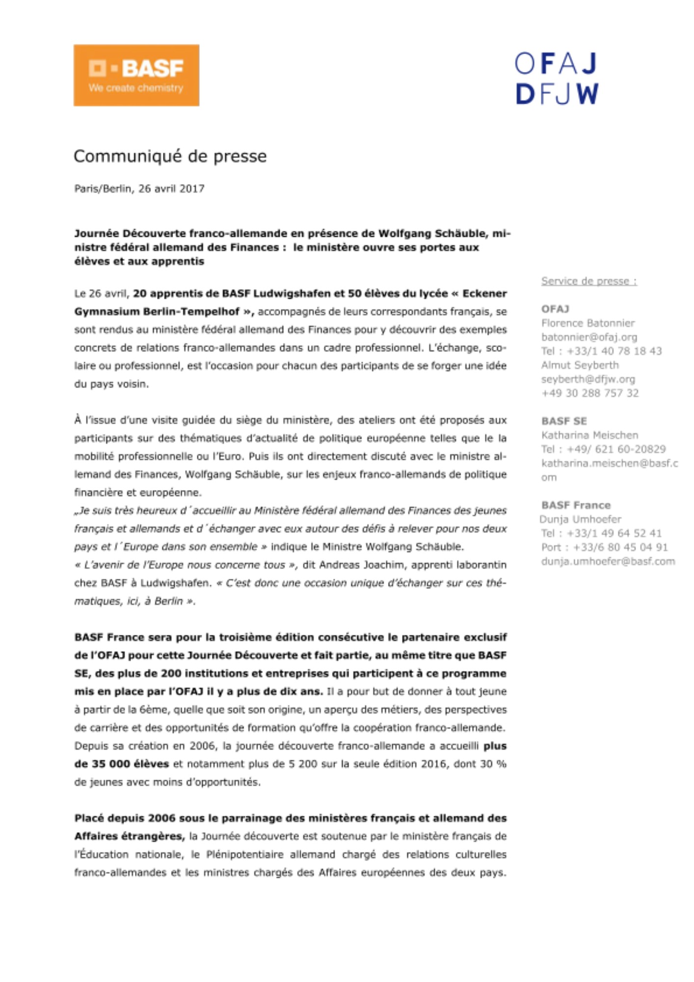 BASF France sera pour la troisième édition consécutive le partenaire exclusif de l’OFAJ pour cette Journée Découverte et fait partie, au même titre que BASF SE, des plus de 200 institutions et entreprises qui participent à ce programme mis en place par l’OFAJ il y a plus de dix ans. Il a pour but de donner à tout jeune à partir de la 6ème, quelle que soit son origine, un aperçu des métiers, des perspectives de carrière et des opportunités de formation qu’offre la coopération franco-allemande. Depuis sa création en 2006, la journée découverte franco-allemande a accueilli plus de 35 000 élèves et notamment plus de 5 200 sur la seule édition 2016, dont 30 % de jeunes avec moins d’opportunités.