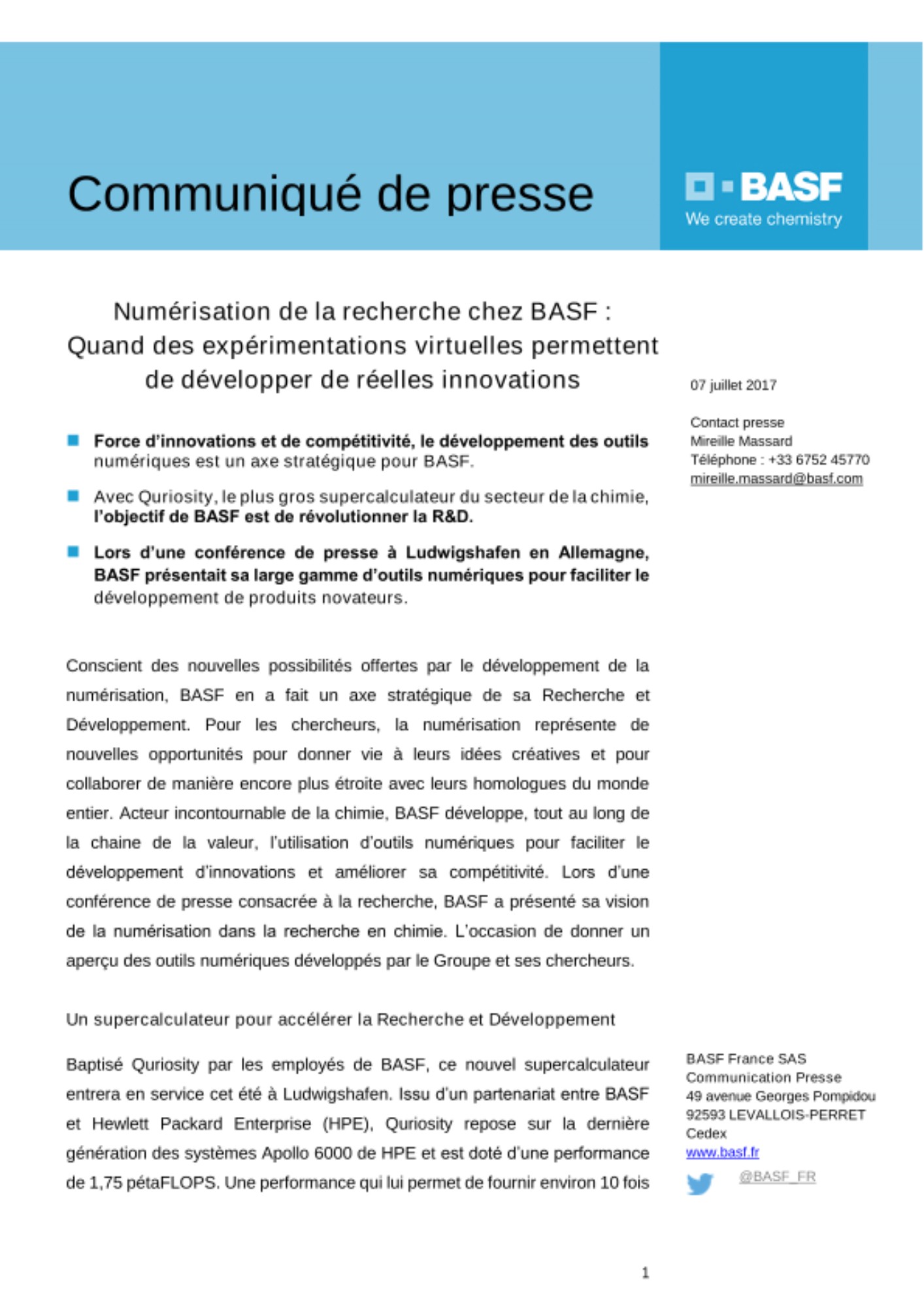Baptisé Quriosity par les employés de BASF, ce nouvel supercalculateur entrera en service cet été à Ludwigshafen. Issu d’un partenariat entre BASF et Hewlett Packard Enterprise (HPE), Quriosity repose sur la dernière génération des systèmes Apollo 6000 de HPE et est doté d’une performance de 1,75 pétaFLOPS. Une performance qui lui permet de fournir environ 10 fois la puissance de calcul que BASF consacre actuellement à l’informatique scientifique. Ce nouveau système permettra de résoudre des questions complexes dans tous les domaines de recherche et raccourcira le délai d’obtention des résultats. Une vraie révolution pour la recherche mondiale en chimie. « Le nouveau supercalculateur favorisera l’application et l’élaboration de démarches complexes de modélisation et de simulation, ce qui ouvrira de toutes nouvelles voies de recherche chez BASF » explique M. Martin Brudermüller, Vice-Président du Conseil d'administration et Directeur de la technologie du Groupe. En simulant, par exemple, plus précisément les processus à la surface des catalyseurs, ou en accélérant la conception de nouveaux polymères aux propriétés définies à l’avance, Quriosity permettra de réduire les délais et les coûts de commercialisation de produits innovants. Occupant la 65ème place du classement des 500 plus gros systèmes informatiques du monde, Quriosity est doté d’un important potentiel pour révolutionner le développement des innovations dans l’industrie de la chimie.
