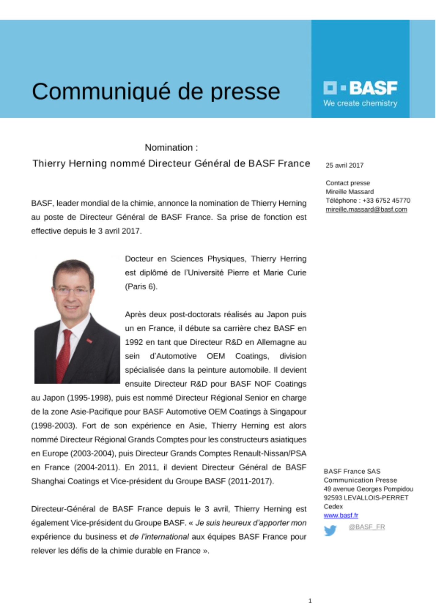 BASF, leader mondial de la chimie, annonce la nomination de Thierry Herning au poste de Directeur Général de BASF France. Sa prise de fonction est effective depuis le 3 avril 2017.