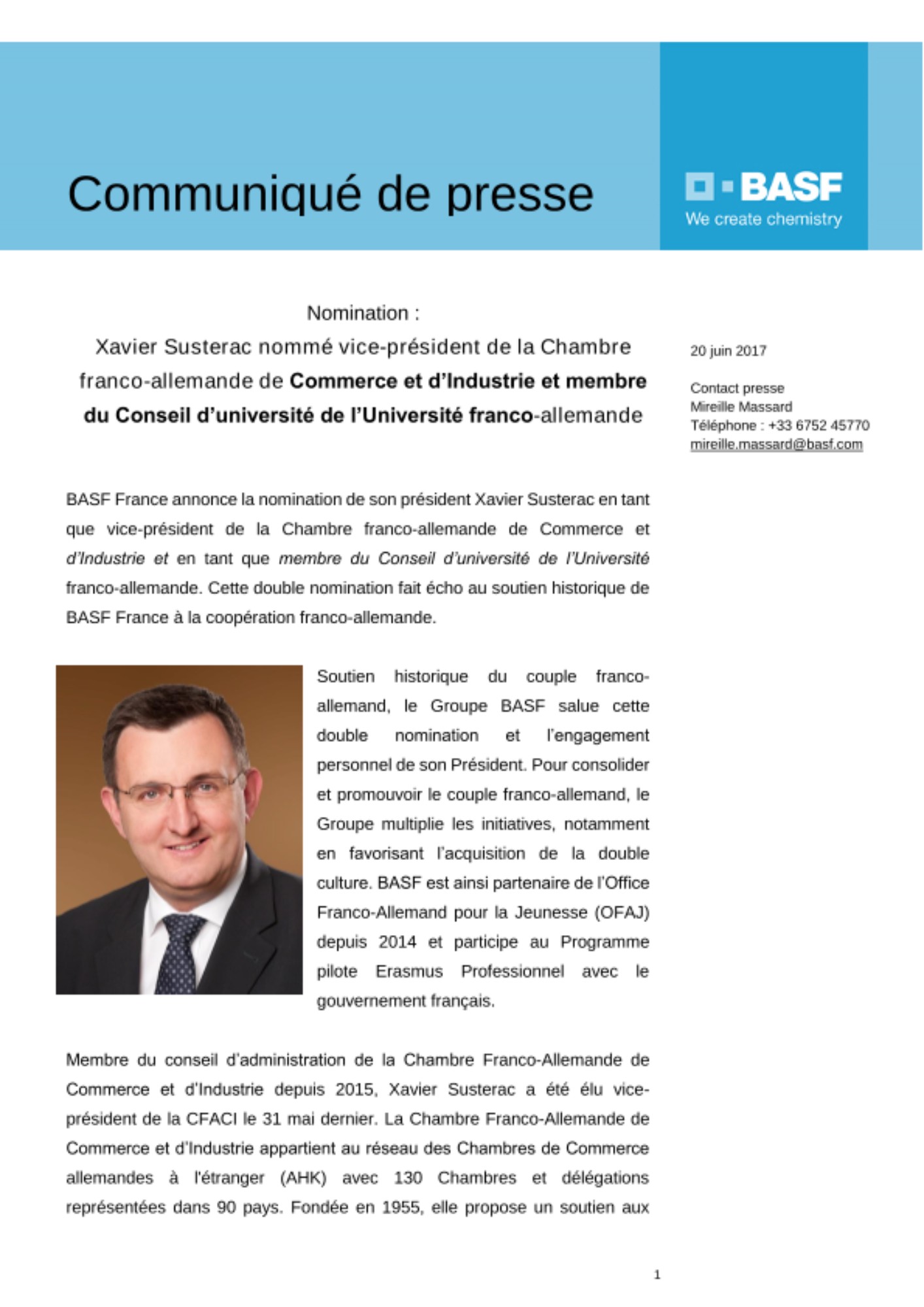 BASF France annonce la nomination de son président Xavier Susterac en tant que vice-président de la Chambre franco-allemande de Commerce et d’Industrie et en tant que membre du Conseil d’université de l’Université franco-allemande. Cette double nomination fait écho au soutien historique de BASF France à la coopération franco-allemande.