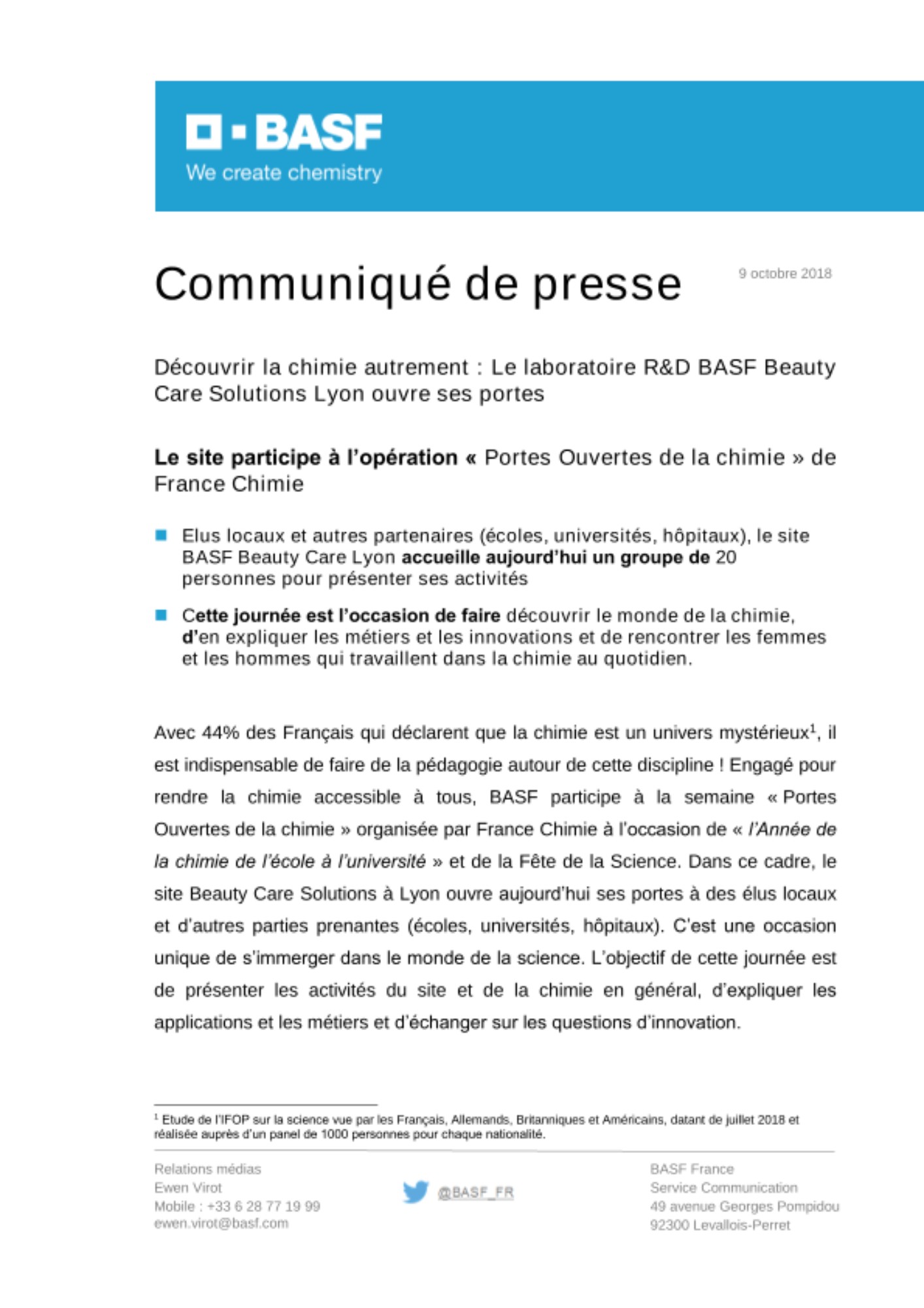 Avec 44% des Français qui déclarent que la chimie est un univers mystérieux1, il est indispensable de faire de la pédagogie autour de cette discipline ! Engagé pour rendre la chimie accessible à tous, BASF participe à la semaine « Portes Ouvertes de la chimie » organisée par France Chimie à l’occasion de « l’Année de la chimie de l’école à l’université » et de la Fête de la Science. Dans ce cadre, le site Beauty Care Solutions à Lyon ouvre aujourd’hui ses portes à des élus locaux et d’autres parties prenantes (écoles, universités, hôpitaux). C’est une occasion unique de s’immerger dans le monde de la science. L’objectif de cette journée est de présenter les activités du site et de la chimie en général, d’expliquer les applications et les métiers et d’échanger sur les questions d’innovation.