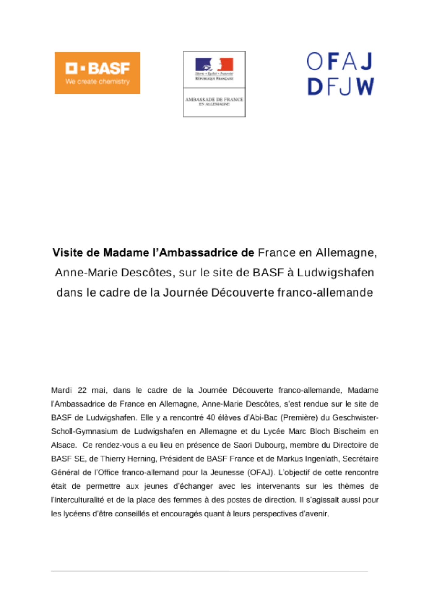 Mardi 22 mai, dans le cadre de la Journée Découverte franco-allemande, Madame l’Ambassadrice de France en Allemagne, Anne-Marie Descôtes, s’est rendue sur le site de BASF de Ludwigshafen. Elle y a rencontré 40 élèves d’Abi-Bac (Première) du Geschwister-Scholl-Gymnasium de Ludwigshafen en Allemagne et du Lycée Marc Bloch Bischeim en Alsace. Ce rendez-vous a eu lieu en présence de Saori Dubourg, membre du Directoire de BASF SE, de Thierry Herning, Président de BASF France et de Markus Ingenlath, Secrétaire Général de l’Office franco-allemand pour la Jeunesse (OFAJ). L’objectif de cette rencontre était de permettre aux jeunes d’échanger avec les intervenants sur les thèmes de l’interculturalité et de la place des femmes à des postes de direction. Il s’agissait aussi pour les lycéens d’être conseillés et encouragés quant à leurs perspectives d’avenir.
