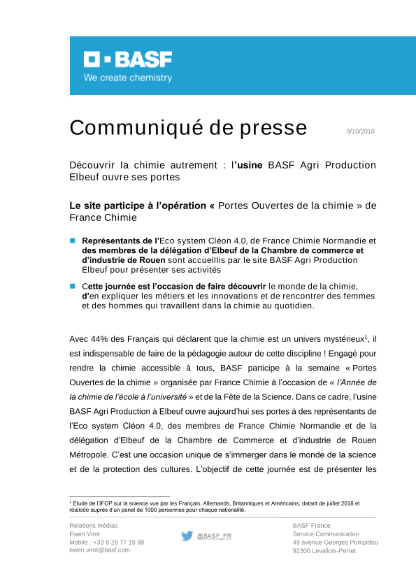 Avec 44% des Français qui déclarent que la chimie est un univers mystérieux1, il est indispensable de faire de la pédagogie autour de cette discipline ! Engagé pour rendre la chimie accessible à tous, BASF participe à la semaine « Portes Ouvertes de la chimie » organisée par France Chimie à l’occasion de « l’Année de la chimie de l’école à l’université » et de la Fête de la Science. Dans ce cadre, l’usine BASF Agri Production à Elbeuf ouvre aujourd’hui ses portes à des représentants de l’Eco system Cléon 4.0, des membres de France Chimie Normandie et de la délégation d’Elbeuf de la Chambre de Commerce et d’industrie de Rouen Métropole. C’est une occasion unique de s’immerger dans le monde de la science et de la protection des cultures. L’objectif de cette journée est de présenter les activités du site et de la chimie en général, d’expliquer les applications et les métiers et d’échanger sur les questions d’innovation.