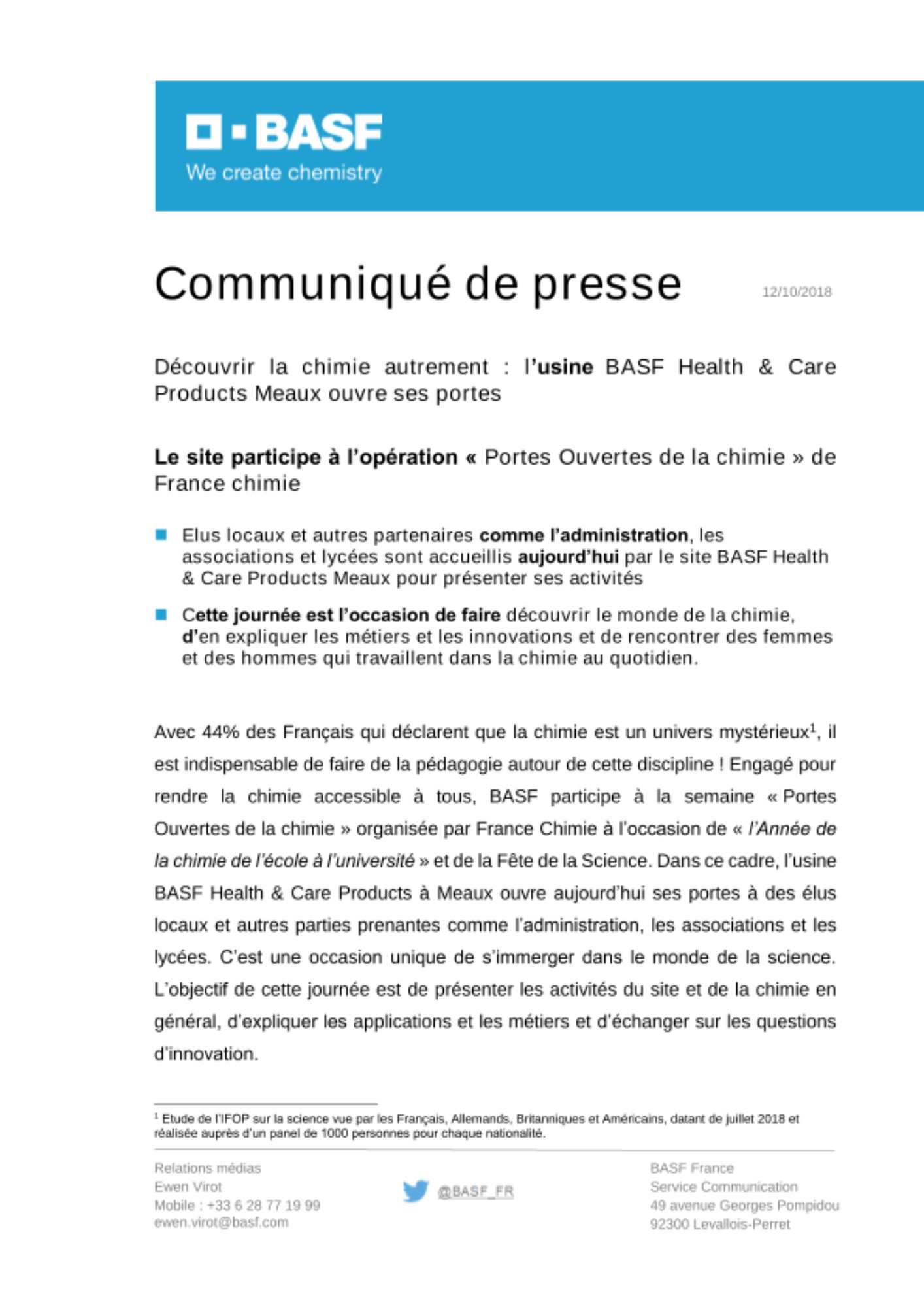 Avec 44% des Français qui déclarent que la chimie est un univers mystérieux1, il est indispensable de faire de la pédagogie autour de cette discipline ! Engagé pour rendre la chimie accessible à tous, BASF participe à la semaine « Portes Ouvertes de la chimie » organisée par France Chimie à l’occasion de « l’Année de la chimie de l’école à l’université » et de la Fête de la Science. Dans ce cadre, l’usine BASF Health & Care Products à Meaux ouvre aujourd’hui ses portes à des élus locaux et autres parties prenantes comme l’administration, les associations et les lycées. C’est une occasion unique de s’immerger dans le monde de la science. L’objectif de cette journée est de présenter les activités du site et de la chimie en général, d’expliquer les applications et les métiers et d’échanger sur les questions d’innovation.
