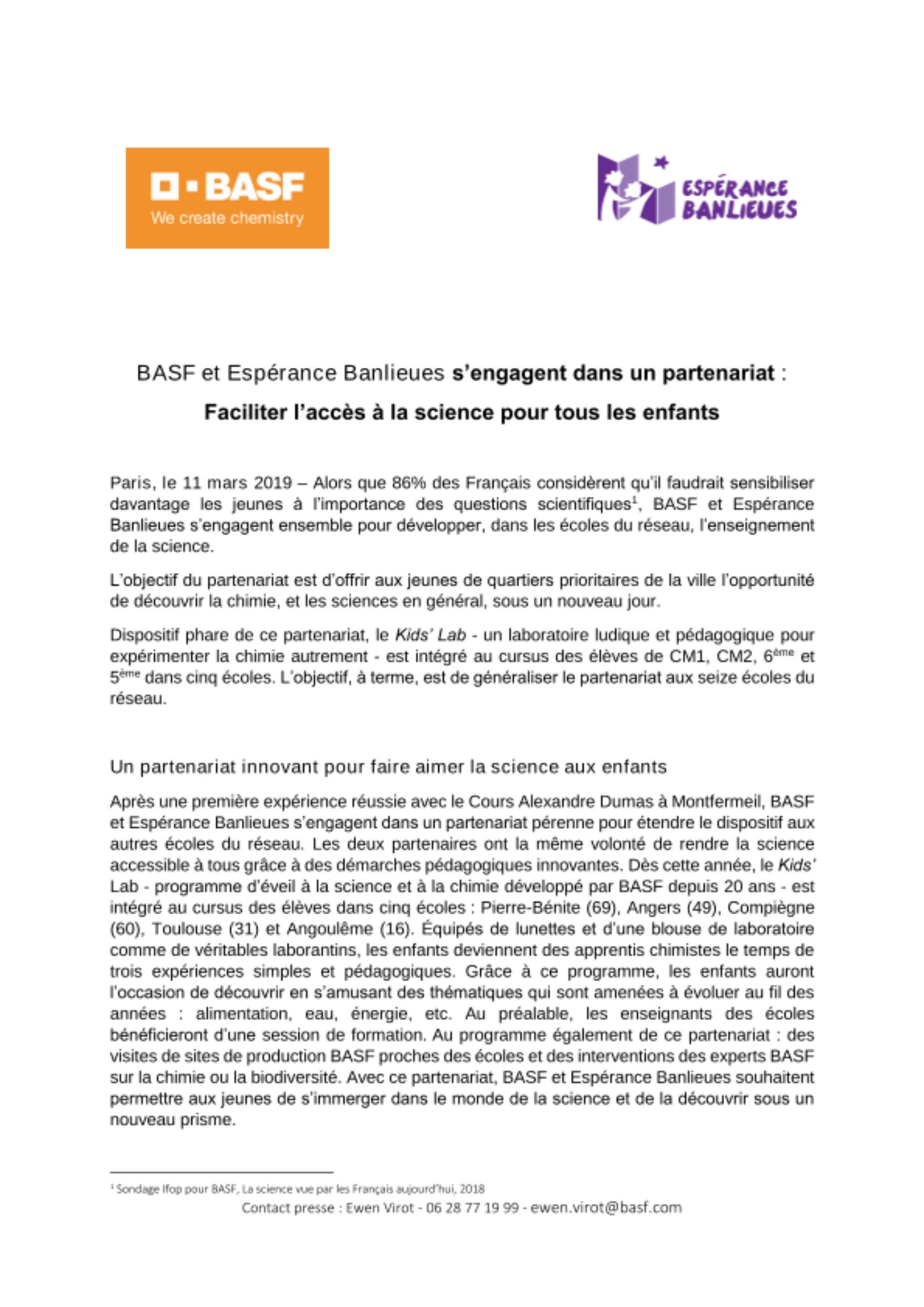 Après une première expérience réussie avec le Cours Alexandre Dumas à Montfermeil, BASF et Espérance Banlieues s’engagent dans un partenariat pérenne pour étendre le dispositif aux autres écoles du réseau. Les deux partenaires ont la même volonté de rendre la science accessible à tous grâce à des démarches pédagogiques innovantes. Dès cette année, le Kids’ Lab - programme d’éveil à la science et à la chimie développé par BASF depuis 20 ans - est intégré au cursus des élèves dans cinq écoles : Pierre-Bénite (69), Angers (49), Compiègne (60), Toulouse (31) et Angoulême (16). Équipés de lunettes et d’une blouse de laboratoire comme de véritables laborantins, les enfants deviennent des apprentis chimistes le temps de trois expériences simples et pédagogiques. Grâce à ce programme, les enfants auront l’occasion de découvrir en s’amusant des thématiques qui sont amenées à évoluer au fil des années : alimentation, eau, énergie, etc. Au préalable, les enseignants des écoles bénéficieront d’une session de formation. Au programme également de ce partenariat : des visites de sites de production BASF proches des écoles et des interventions des experts BASF sur la chimie ou la biodiversité. Avec ce partenariat, BASF et Espérance Banlieues souhaitent permettre aux jeunes de s’immerger dans le monde de la science et de la découvrir sous un nouveau prisme.