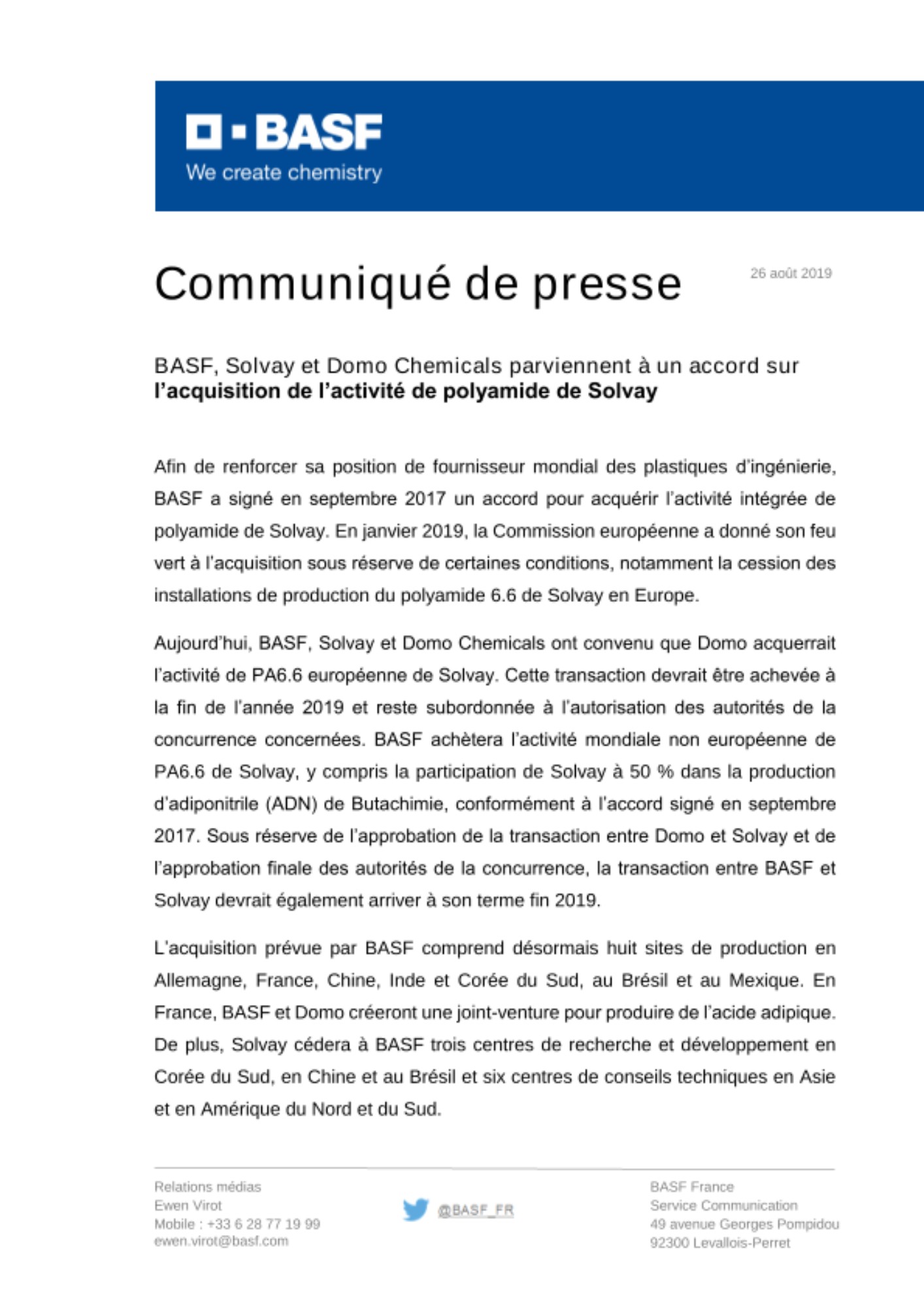 Aujourd’hui, BASF, Solvay et Domo Chemicals ont convenu que Domo acquerrait l’activité de PA6.6 européenne de Solvay. Cette transaction devrait être achevée à la fin de l’année 2019 et reste subordonnée à l’autorisation des autorités de la concurrence concernées. BASF achètera l’activité mondiale non européenne de PA6.6 de Solvay, y compris la participation de Solvay à 50 % dans la production d’adiponitrile (ADN) de Butachimie, conformément à l’accord signé en septembre 2017. Sous réserve de l’approbation de la transaction entre Domo et Solvay et de l’approbation finale des autorités de la concurrence, la transaction entre BASF et Solvay devrait également arriver à son terme fin 2019.