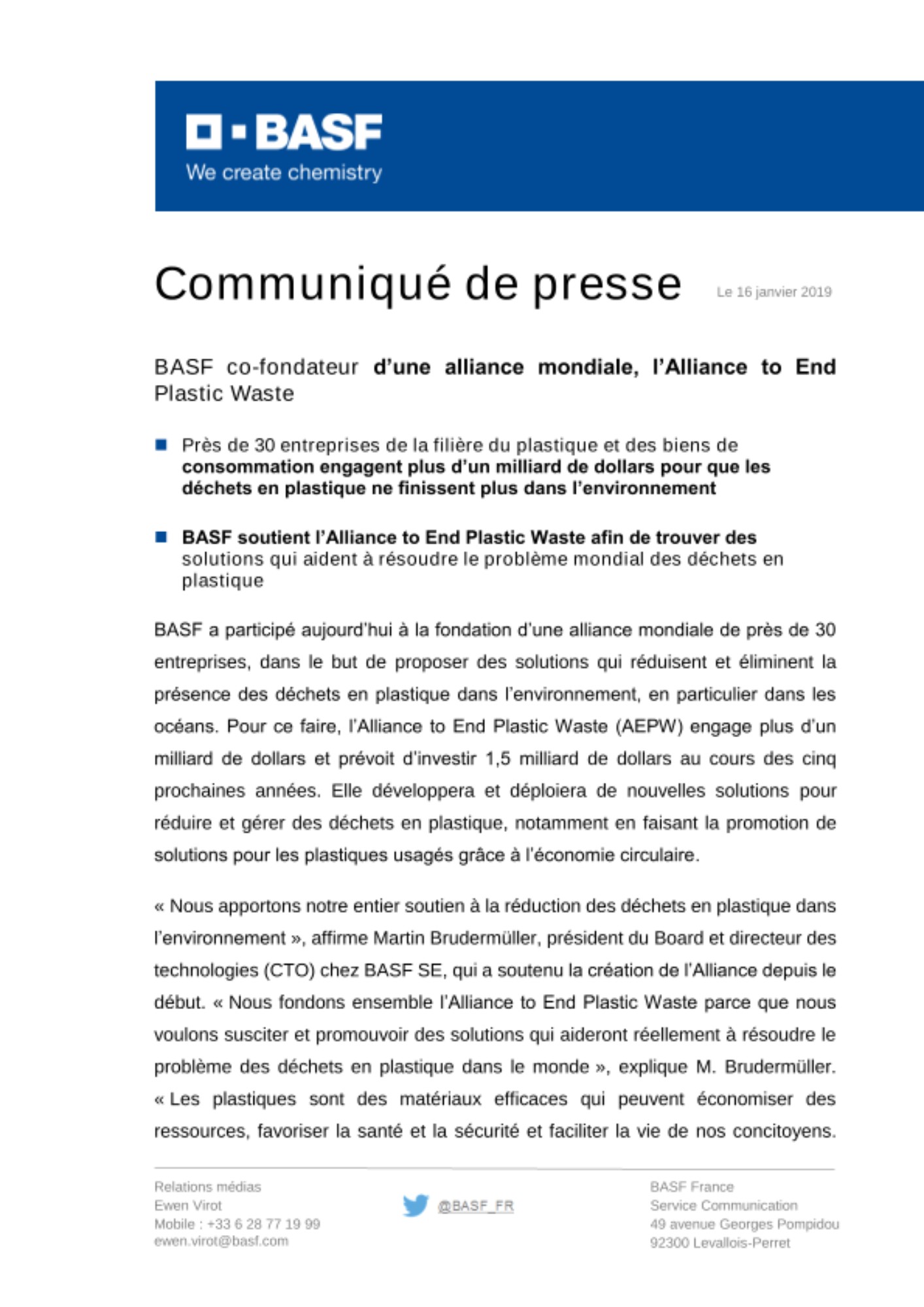 « Nous apportons notre entier soutien à la réduction des déchets en plastique dans l’environnement », affirme Martin Brudermüller, président du Board et directeur des technologies (CTO) chez BASF SE, qui a soutenu la création de l’Alliance depuis le début. « Nous fondons ensemble l’Alliance to End Plastic Waste parce que nous voulons susciter et promouvoir des solutions qui aideront réellement à résoudre le problème des déchets en plastique dans le monde », explique M. Brudermüller. « Les plastiques sont des matériaux efficaces qui peuvent économiser des ressources, favoriser la santé et la sécurité et faciliter la vie de nos concitoyens. Ces bénéfices pourraient être réduits à néant si les plastiques et leurs déchets ne sont ni utilisés, ni éliminés, ni recyclés de façon responsable. »