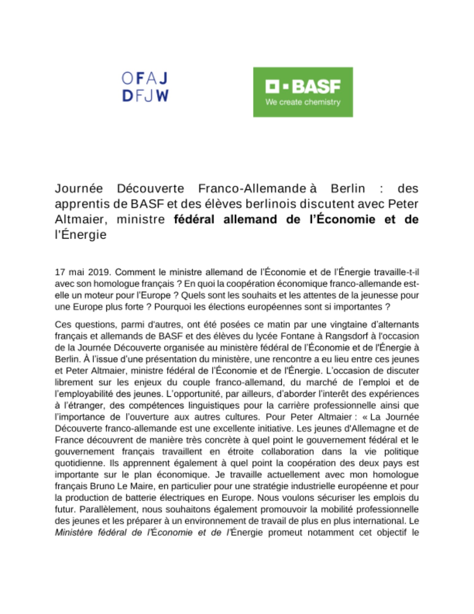 Le ministère fédéral de l’Économie et de l'Énergie fait partie des 200 institutions et entreprises qui participent à la Journée Découverte organisée par l'Office franco-allemand pour la jeunesse (OFAJ). Ces institutions et entreprises donnent aux élèves à partir de la 6e un aperçu de leur travail et les informent sur les opportunités et perspectives de carrière et les formations disponibles dans un cadre franco-allemand. Depuis sa création en 2006, la Journée Découverte a accueilli plus de 50 000 élèves et est placée sous le parrainage des ministères français et allemand des Affaires étrangères. Elle est par ailleurs soutenue par le ministère français de l’Éducation nationale, le Plénipotentiaire allemand chargé des relations culturelles franco-allemandes et les ministres chargés des Affaires européennes des deux pays. Pour Tobias Bütow, Secrétaire Général de l’OFAJ : « La Journée Découverte est une opportunité qui permet à des jeunes de tous horizons de découvrir le monde du travail. Ce programme peut également les inciter à l’apprentissage de la langue du pays partenaire, véritable atout pour leur parcours professionnel. Nous sommes heureux d’être soutenus dans ce projet depuis maintenant cinq ans par BASF avec qui nous partageons l’engagement pour la jeunesse franco-allemande et européenne. »