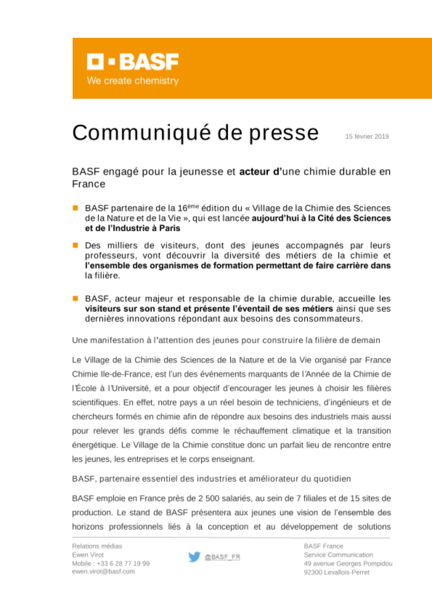 ◼ BASF partenaire de la 16ème édition du « Village de la Chimie des Sciences de la Nature et de la Vie », qui est lancée aujourd’hui à la Cité des Sciences et de l’Industrie à Paris