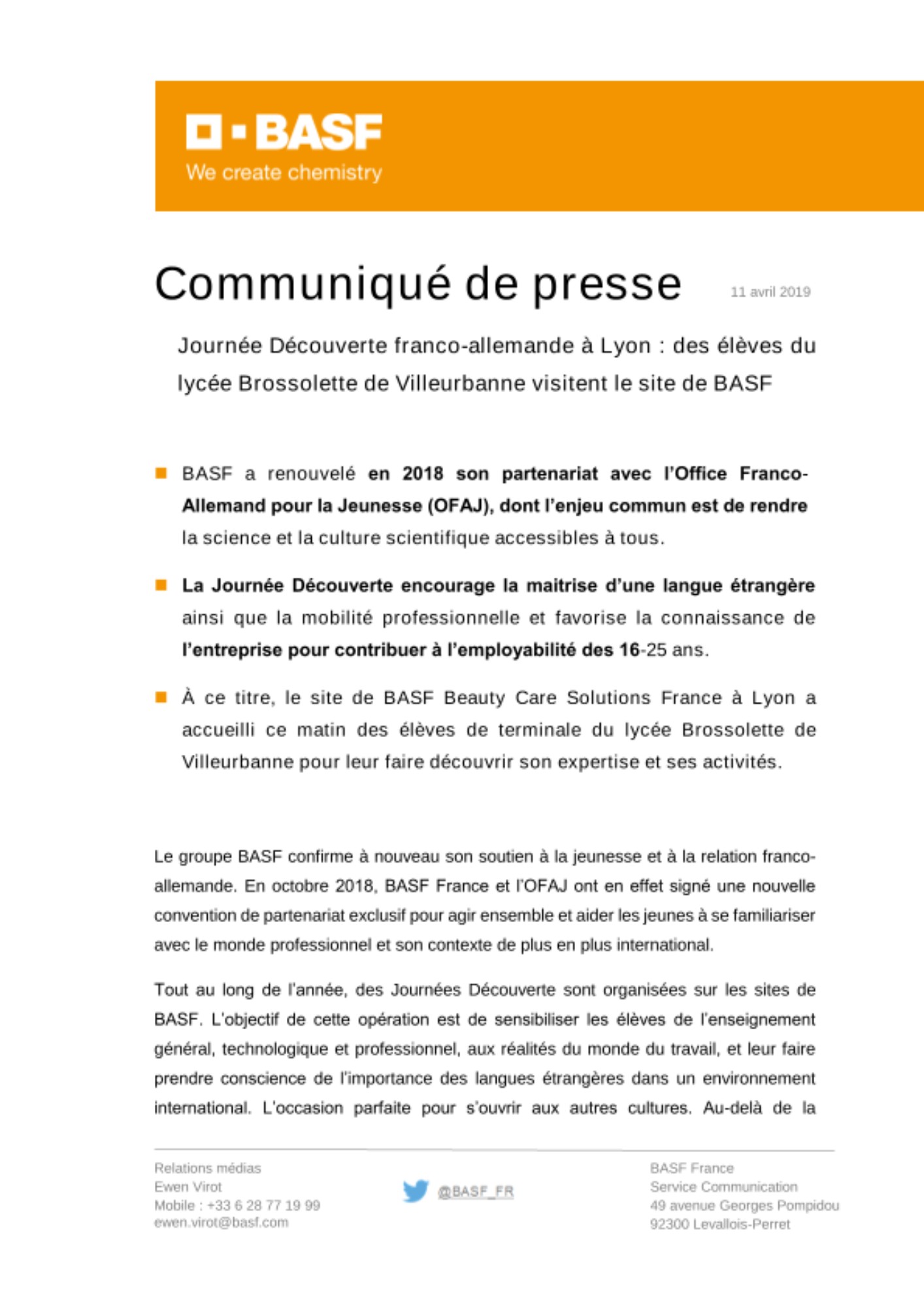 Le site BASF Beauty Care Solutions France à Lyon a reçu aujourd’hui des élèves de terminale en filière scientifique au lycée Brossolette de Villeurbanne. Les élèves ont été accueillis sur l’un des deux sites de BASF Beauty Care Solutions en France. Ils ont découvert les coulisses d’une entreprise, dont l’expertise est mondialement reconnue dans la cosmétique et qui commercialise des actifs de haute-technologie rentrant dans la composition de produits cosmétiques destinés au soin de la peau. Ses clients sont les laboratoires des grandes marques de cosmétiques internationales. Les élèves ont pu découvrir des technologies de BASF Beauty Care solutions qui ont forgé sa réputation mondiale, telle que le laboratoire de production de peaux reconstruites. Pour David Hérault (R&D Global Director - BASF Beauty Creations) : « Nous sommes très heureux d’accueillir ces jeunes, et fiers de valoriser notre expertise, nos métiers et nos équipes. Participer à cette opération était par ailleurs important pour nous au regard de notre engagement pour la jeunesse. En effet, beaucoup de jeunes arrivent sur le marché du travail sans avoir été préparés à cette réalité, il est donc primordial de leur donner une première expérience de l’entreprise ».
