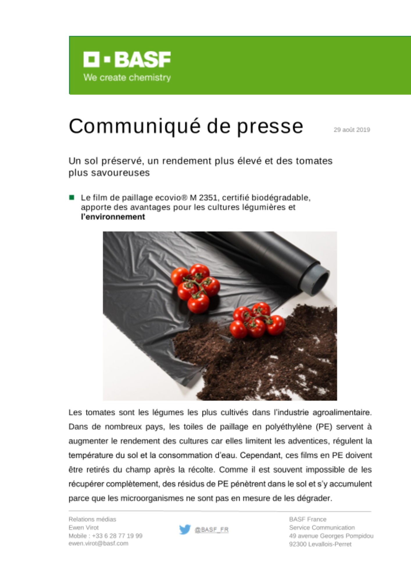 Avec ecovio® M 2351, BASF propose, pour le paillage des cultures, un plastique certifié biodégradable dans le sol, composé du copolyester biodégradable ecoflex® en polybutyrate adipate téréphtalate (PBAT) et d’autres polymères en matières premières renouvelables et biodégradables. Les films de paillage en ecovio® M 2351 peuvent être enterrés dans le sol après la récolte, puisque les microorganismes naturellement présents dans la terre métabolisent les éléments de la structure du film. En outre, les films de paillage en ecovio® peuvent augmenter le rendement des tomates de 15 à 20 %, réduire la consommation d’eau, limiter la pousse des adventices et réduire ainsi l’application d’herbicides par rapport à l’agriculture sur sol nu. Les maraîchers ont également observé une plus grande résistance des plants aux maladies fongiques, une récolte plus précoce, une qualité plus homogène des tomates et un degré Brix plus élevé, autrement dit un meilleur ratio entre sucre et eau dans les tomates. Il est ainsi possible de combiner agriculture durable et production maraichère performante, avec des rendements plus élevés et des produits de qualité supérieure.