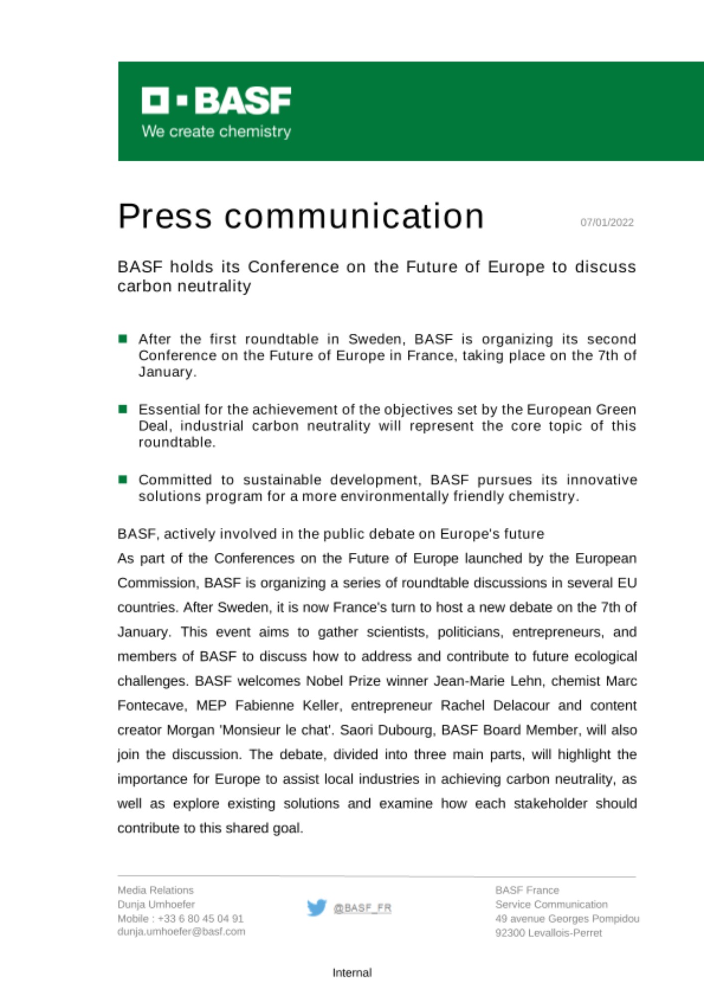 - Après une première table ronde en Suède, BASF poursuit l’organisation de sa Conférence sur l’avenir de l’Europe en France, avec un événement le 7 janvier