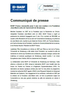 Membre fondateur en 2007 de la Fondation pour la Recherche en Chimie, rebaptisée Fondation Jean-Marie Lehn en 2022, BASF France a signé un partenariat de mécénat l’engageant pour 5 ans. D’un montant de 500.000€, ce soutien a été officialisé le 29 mai au sein de l’Université de Strasbourg, en présence de Jean-Marie Lehn, lauréat du prix Nobel de Chimie (1987), de Thomas Ebbesen, prix Kavli et directeur de la Fondation, membre du Conseil présidentiel de la science, et de Nicolas Naudin, Président de BASF France.